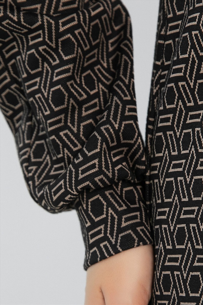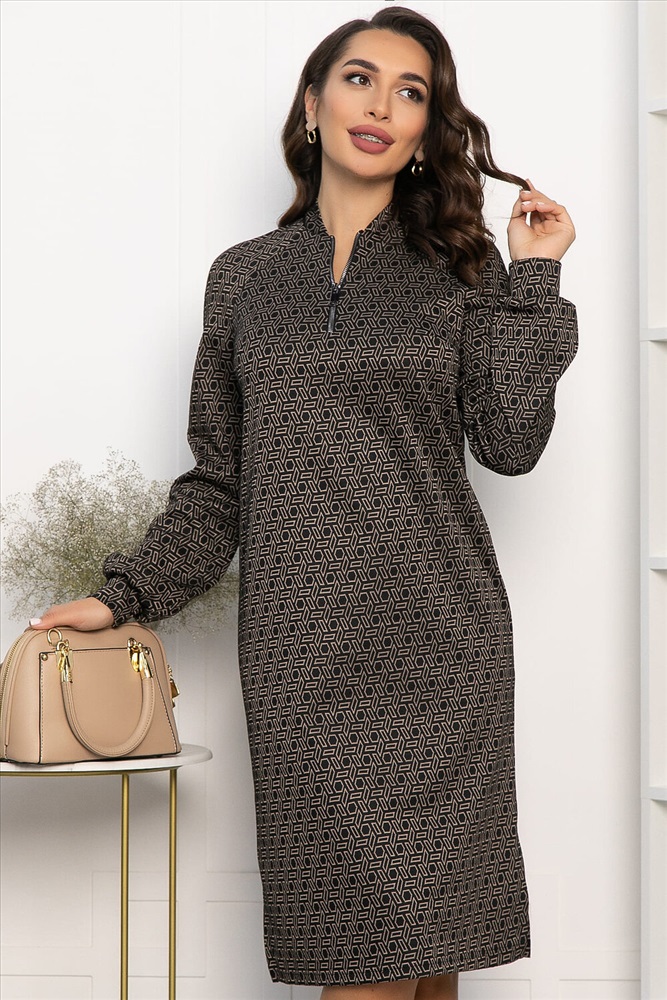 Принт в минималистичном стиле на спокойном коричневом фоне придаёт образу особую изысканность. Платье легко сочетается с различными аксессуарами и обувью.