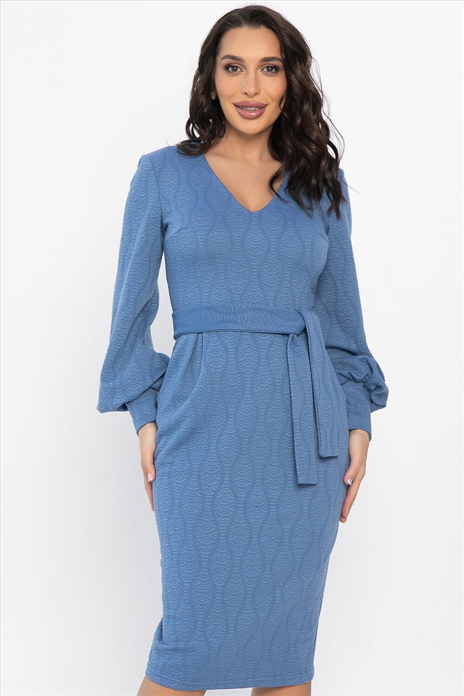 Элегантное платье из фактурной ткани создано для того, чтобы быть в центре внимания! Идеально подчеркивает преимущества фигуры. Рукав длинный, втачной, по низу широкий манжет. В комплект входит пояс из основной ткани.