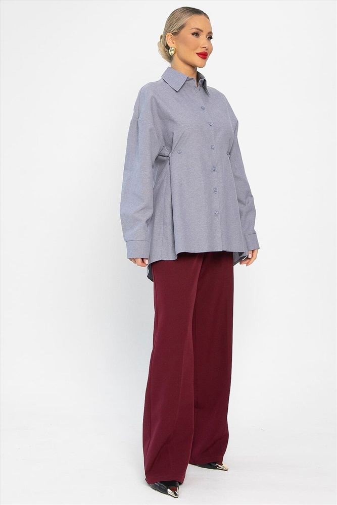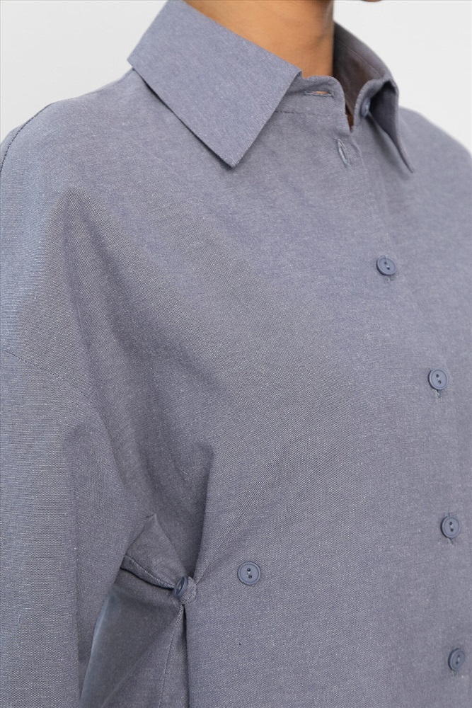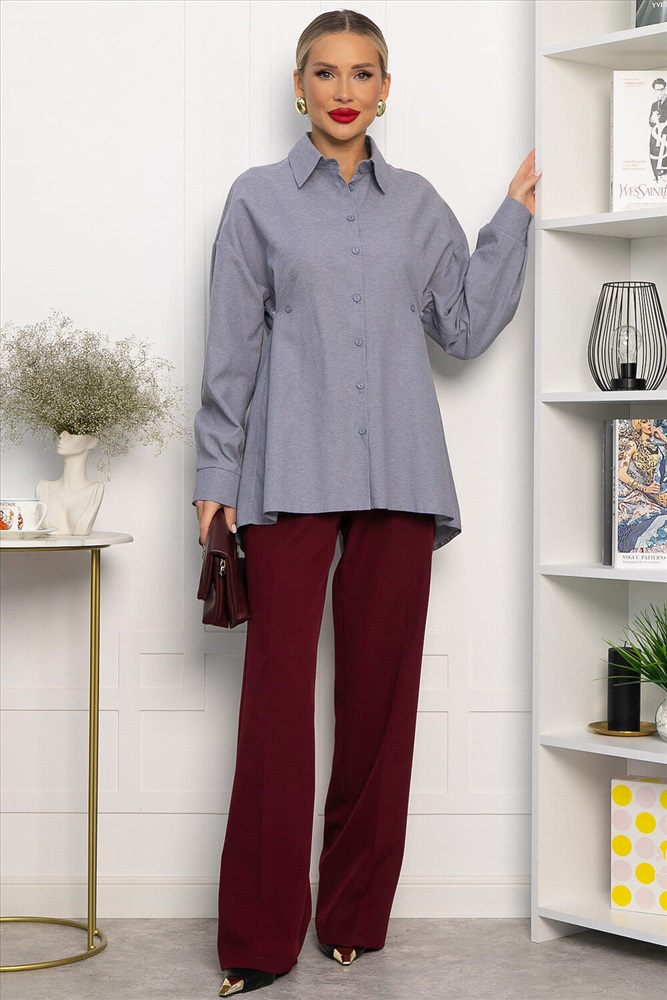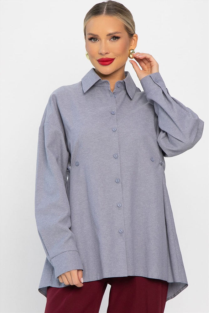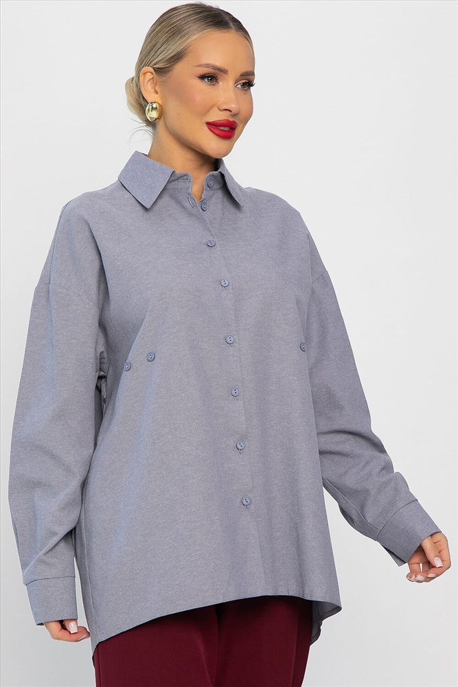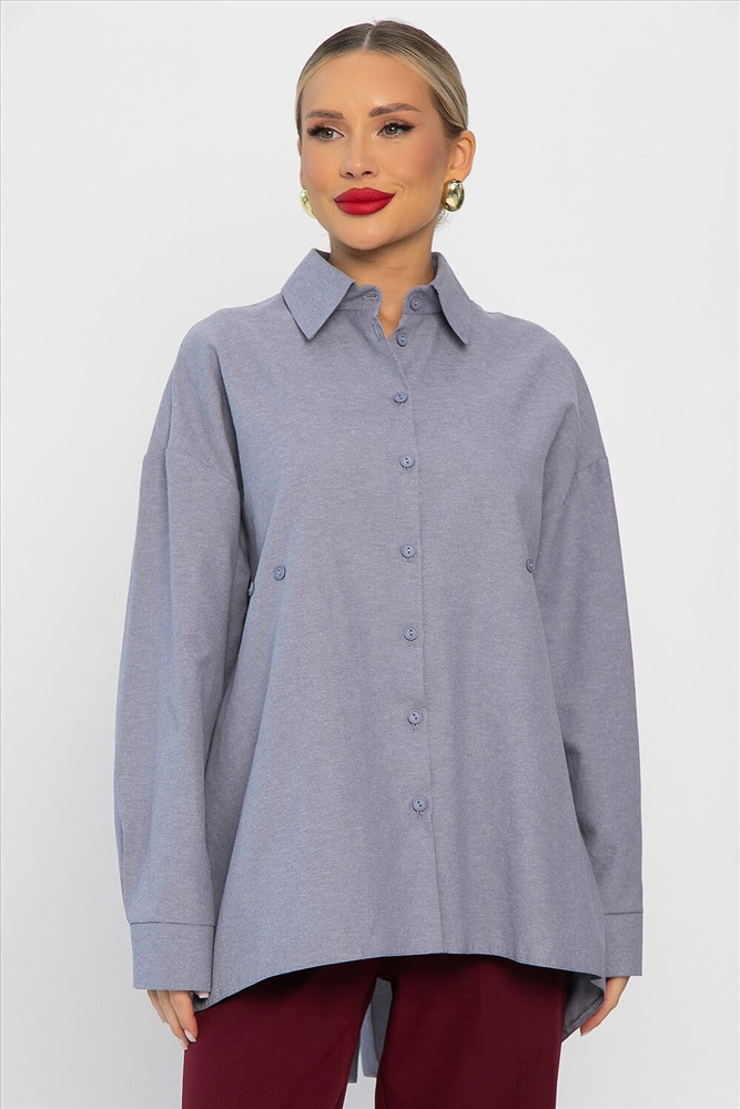 Однотонная оверсайз рубашка — ключевой элемент базового гардероба. Пуговицы, подобранные в тон ткани, придают изделию утонченный вид. Длинные рукава завершаются аккуратными манжетами. Особенностью этой рубашки являются дополнительные пуговицы по бокам спереди, которые помогают подчеркнуть линию талии. На спинке пуговицы декоративные. Рубашку можно носить самостоятельно, дополнив аксессуарами, или надевать поверх топа или футболки, создавая разнообразные образы для любого случая.