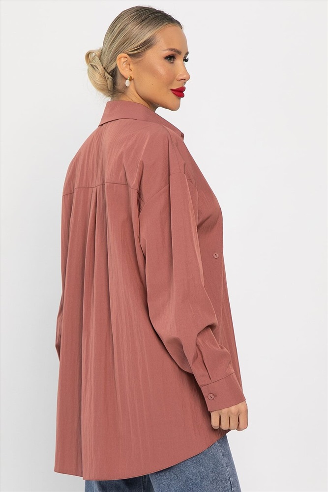 Рубашка свободного кроя в терракотовом цвете — это сочетание современного стиля и практичности. Воротник-стойка придаёт ей элегантность, а манжеты на рукавах обеспечивают удобство. Пуговицы в тон ткани создают аккуратный и гармоничный образ. Особенность этой модели — дополнительные пуговицы на талии спереди и боковые петельки, которые позволяют подчеркнуть силуэт. Их можно застёгивать по мере необходимости. Это идеальный выбор для тех, кто хочет выглядеть стильно и чувствовать себя комфортно в повседневной одежде. У данной расцветки ткань с эффектом жатки.