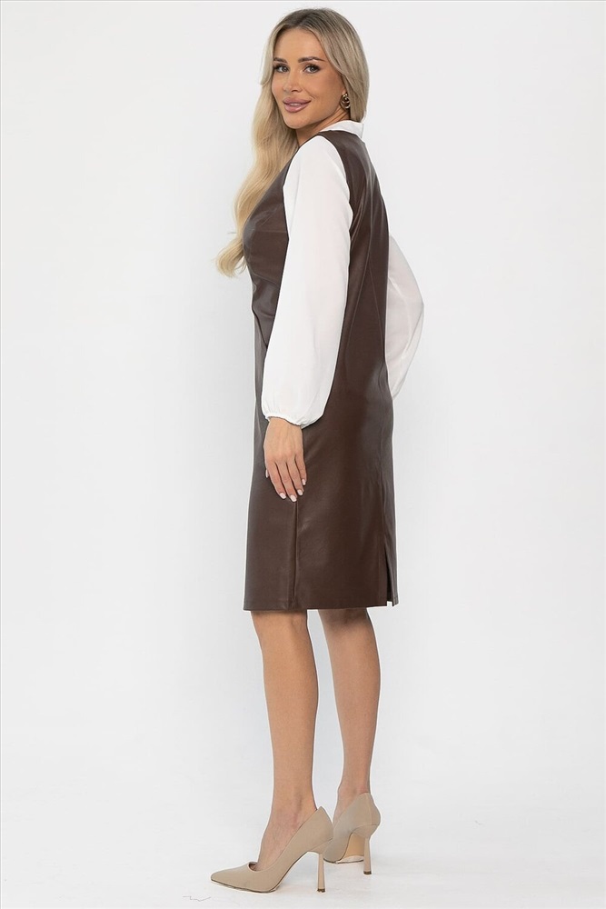 Оригинальная модель сарафана в шоколадном цвете из качественной экокожи на тканевой основе. Необычный крой делает эту модель особенной, привлекательной и необычной. Сарафан без рукавов и имеет достаточно свободную пройму, что позволяет сочетать его с блузами абсолютно любого кроя. Цвет изделия является актуальным в любом сезоне. Такая вещь актуальна как для офиса, деловых встреч, так и для праздничных мероприятий.