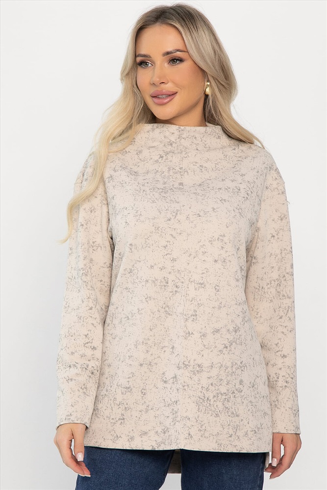 Свободный крой и спущенные рукава создают непринуждённый образ, а цельнокроеная стойка придаёт ему современный вид. Разрезы по бокам обеспечивают свободу движений и делают силуэт более интересным.