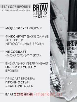 Гель для бровей BROW SUPER FIX 12H бренда Люкс Визаж Белорусской косметики надежно фиксирует даже самые жесткие и непослушные брови на 12 часов. Фиксатор с прозрачной текстурой обволакивает волоски тончайшей невидимой пленкой, увеличивая объем и густоту. Гель для долгосрочной укладки и фиксации быстро высыхает, сохраняя естественный вид, не оставляет белый налет, не склеивает и не создает эффекта мокрых волосков. Можно использовать как самостоятельно, так и после любых средств для макияжа, чтобы повысить их стойкость. Густая нейлоновая щеточка позволяет набирать оптимальное количество, равномерно распределяет его по всей длине по направлению роста волос, тщательно прочесывает, придает и фиксирует желаемую форму. Д-пантенол в составе питает и увлажняет, помогает улучшить их прочность и эластичность.
