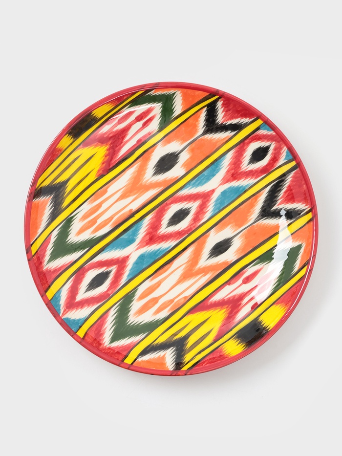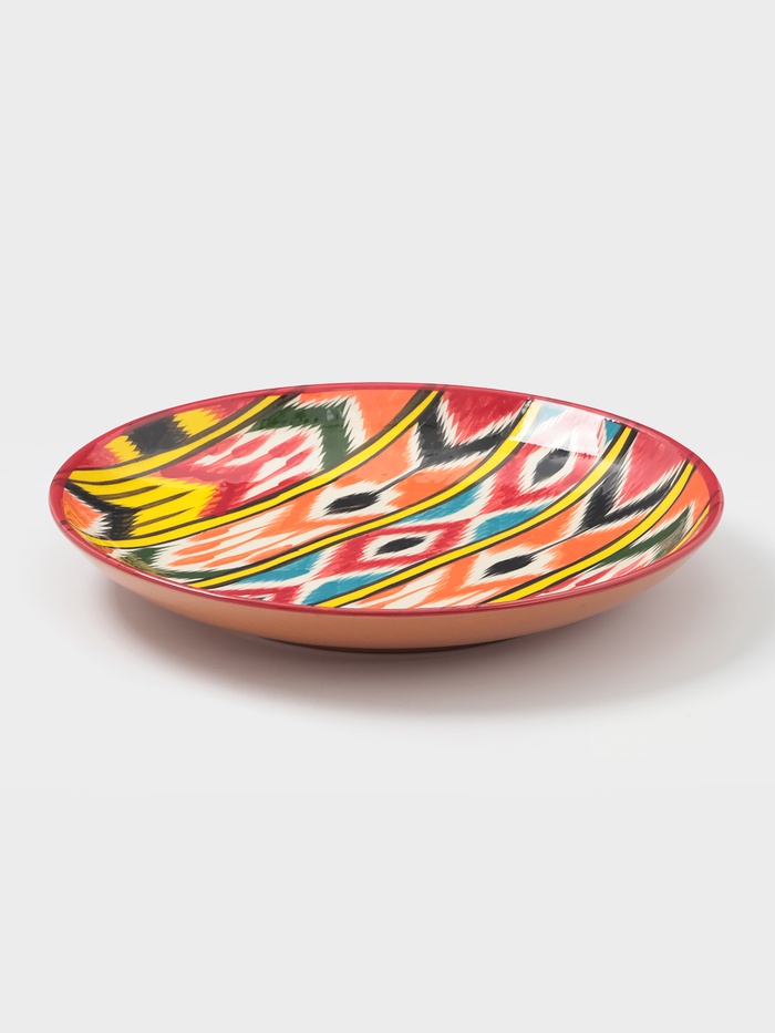 Керамическая плоская тарелка с орнаментом — это яркое сочетание узбекского мастерства и художественного видения, где каждый цвет и линия передают историю ремесла. Изделие диаметром 32 см выполнено вручную и украшено разноцветным узором, вдохновлённым народными мотивами Риштана. Компактный размер и живой рисунок делают его универсальным решением для сервировки и декора.