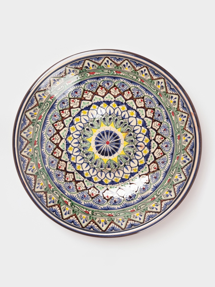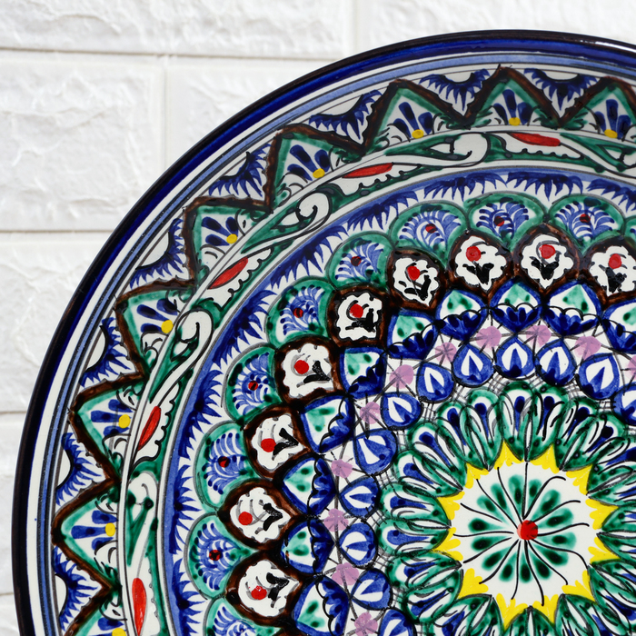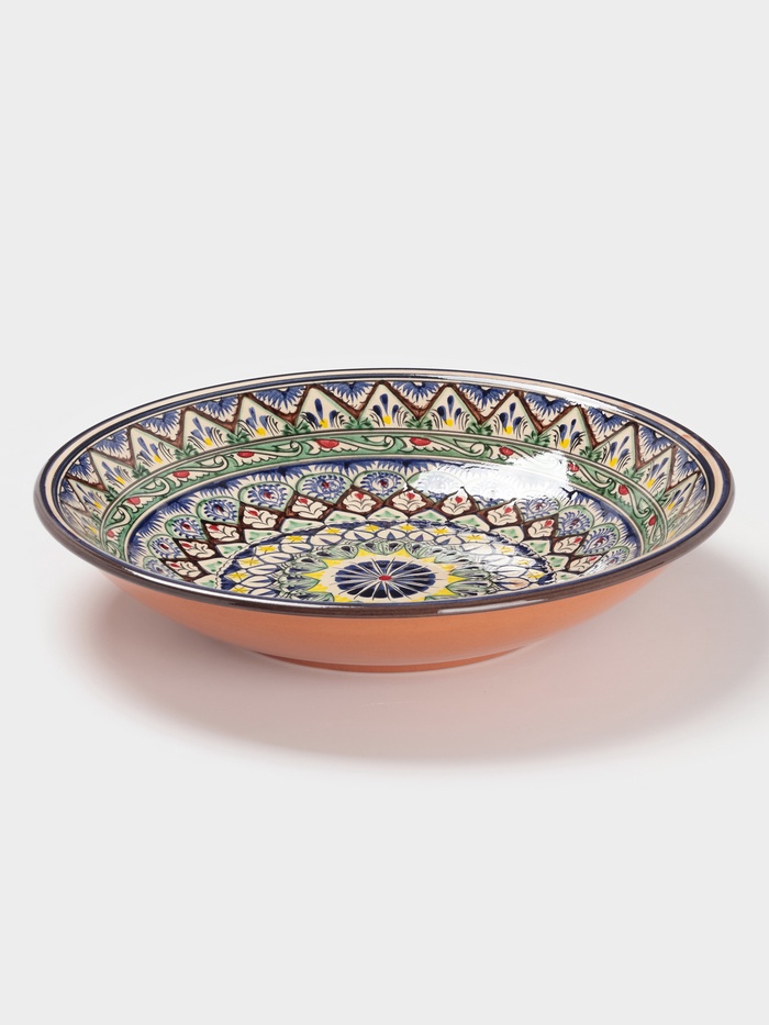 Керамическая глубокая тарелка с растительным орнаментом — это отражение узбекского ремесленного искусства и любви к деталям. Изделие диаметром 33 см выполнено вручную, что делает его не просто посудой, а элементом культуры. Синий узор на светлом фоне напоминает старинные узоры Риштана, создавая атмосферу гостеприимства и тепла.