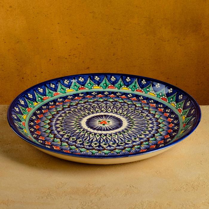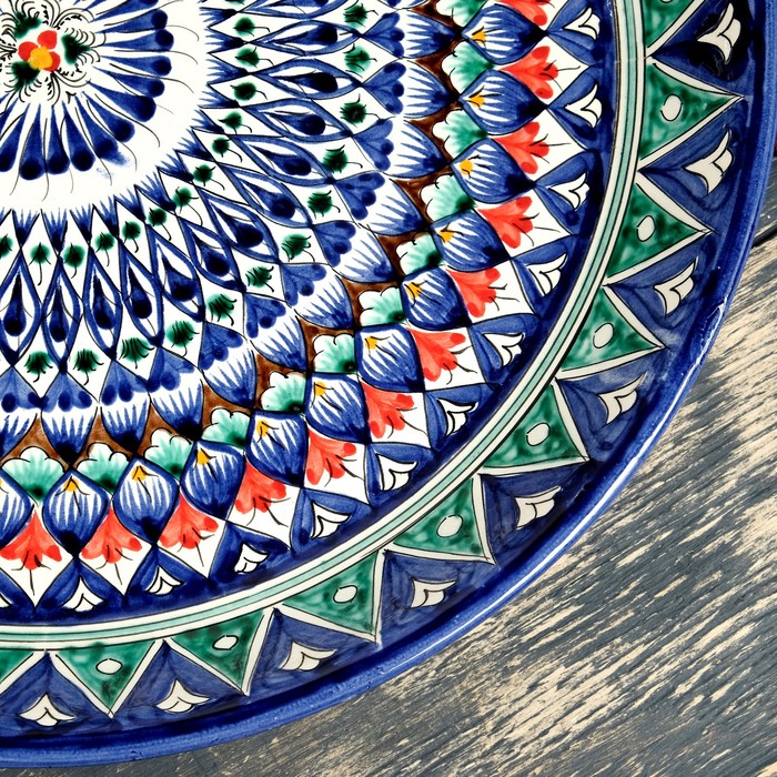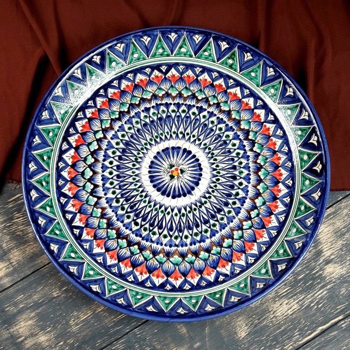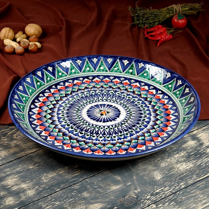 Габариты: 37 x 37 x 4,5 Страна: Узбекистан В боксе: 16 шт Состав: Керамика Материалы: керамика Фасовка: по 1 шт Индивидуальная упаковка: Без упаковки Сертификат: СТР Набор: Нет Цвет: Синий Форма: Круглая Диаметр, см: 36 Тематика: Цветочно-растительная, Растительный орнамент Рисунок: Да Крышка: Нет Материал: Керамика Можно мыть в посудомоечной машине: Нет Можно использовать в СВЧ-печи: Да Особенности: Глазурованные Посуда с национальной росписью станет отменным подарком для ценителей высокородной посуды. Риштан — город на востоке Узбекистана, один из древнейших в Ферганской долине. С давних времён Риштан славится своим гончарным искусством изготовления цветной керамики. Красноватую глину для изделия добывают в самом городе. Мастера утверждают, что их глина настолько высокого качества, что даже не нуждается в предварительной обработке. Дополните коллекцию кухонных аксессуаров пряными восточными нотами. Все товары производства Узбекистан. ДополнительноКомментарии к товару
