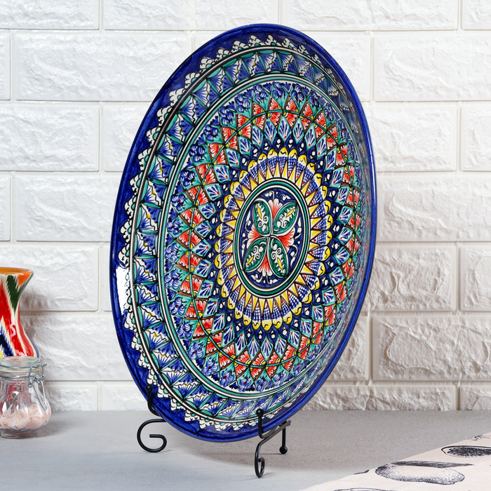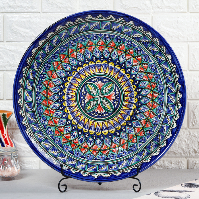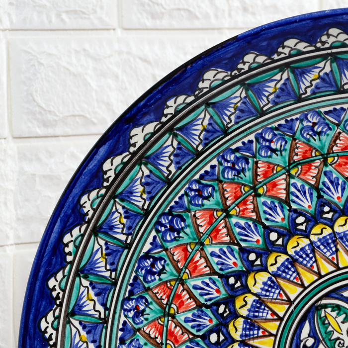 Создайте атмосферу восточного гостеприимства с нашей большой керамической тарелкой ручной работы, украшенной узорами в синих тонах. Эта плоская сервировочная тарелка диаметром 42 см идеально подходит для подачи плова и других блюд для большой компании.
