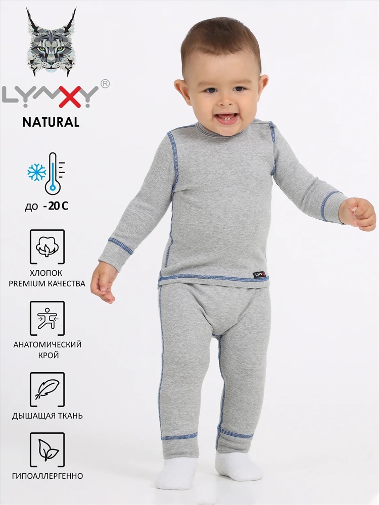Термокомплект для малышей из лонгслива и кальсон выполнен из эластичного хлопкового полотна. Имеет специальный крой для удобства ношения с подгузником. Легко впитывает влагу, позволяя коже "дышать". Подходит для ежедневного использования в качестве нательного белья в холодную погоду до -20 градусов при низкой физической активности. Уход: деликатная машинная стирка при температуре до 40 градусов без предварительного замачивания.