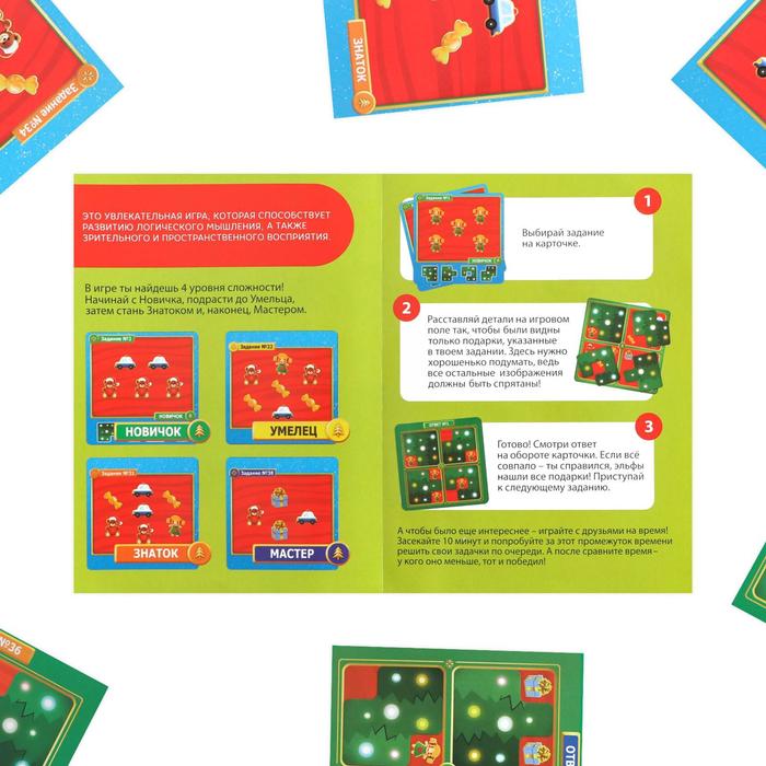 Вы получите карточку с заданием от эльфов. В набор входят магнитные детали и поле с изображением игрушек. Поместите элементы на него так, чтобы были видны только те предметы, которые указаны в задании. А после смотрите ответ на обороте карты. Вот такая увлекательная задачка!