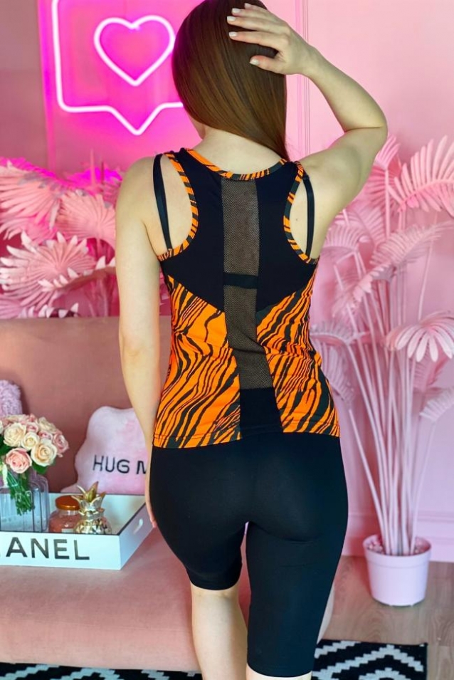 Майка-борцовка прилегающего силуэта, средней длины, с округлой горловиной. Вдоль спинки расположена вставка из сетки. Горловина и проймы майки обработаны бейкой из основного полотна.