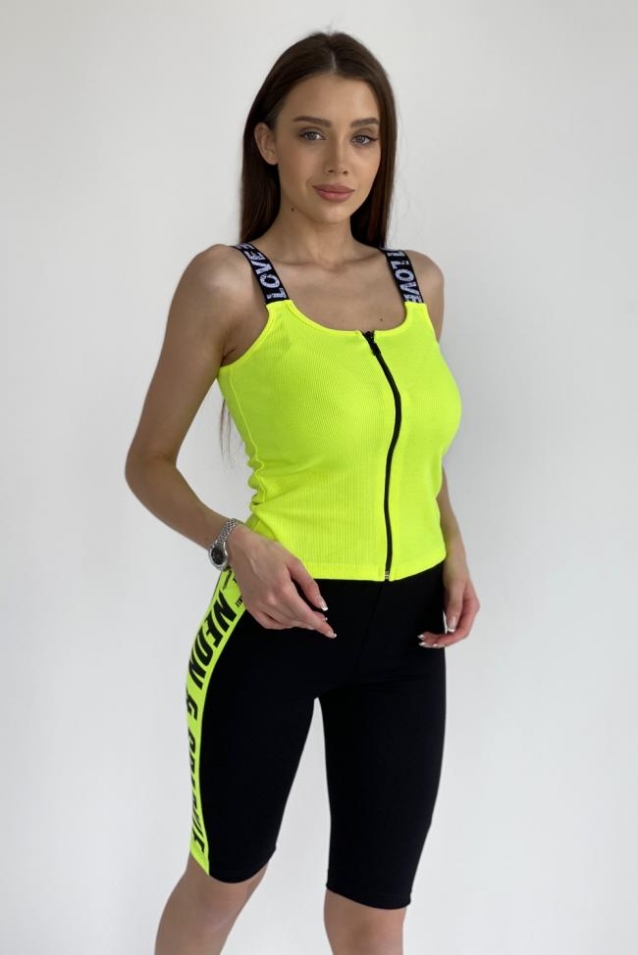 Майка облегающая, средней длины, с округлой горловиной. Размер регулируется за счет эластичности полотна. Бретели выполнены из эластичной тесьмы с надписями. Горловина и проймы обработаны бейкой из основного полотна.