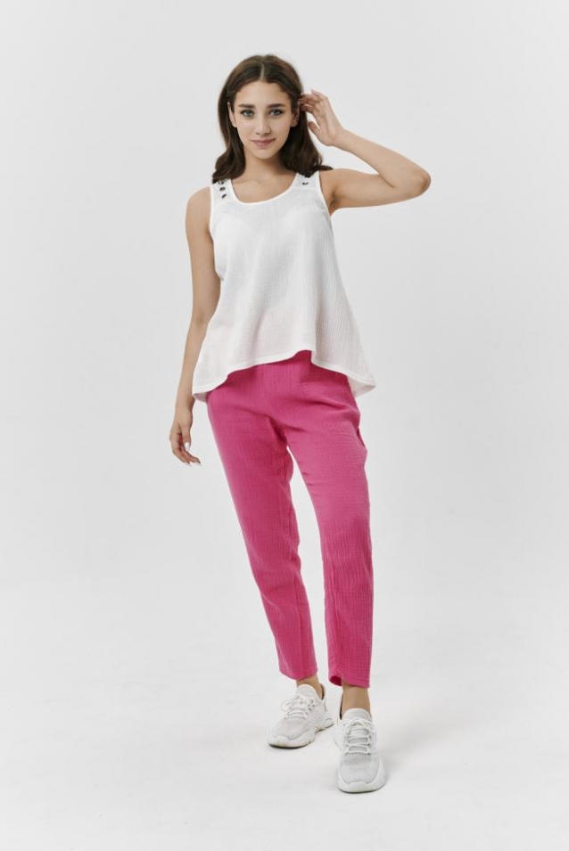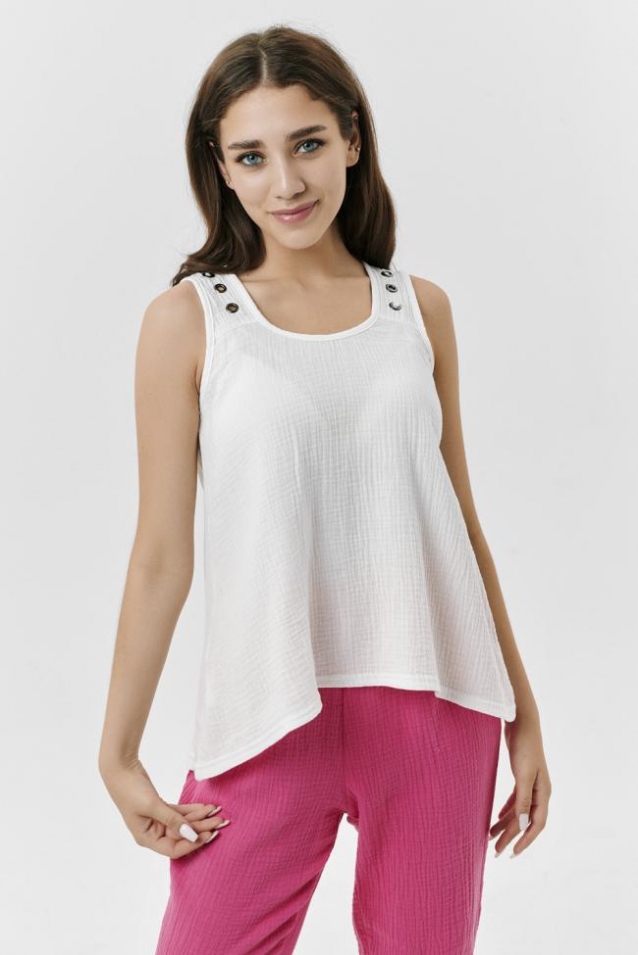 Майка трапецивидного силуэта средней длины, с округлой горловиной, без рукавов, с удлиненной спинкой. На кокетках полочки расположены декоративные люверсы. Горловина и проймы обработаны бейкой из основного полотна.