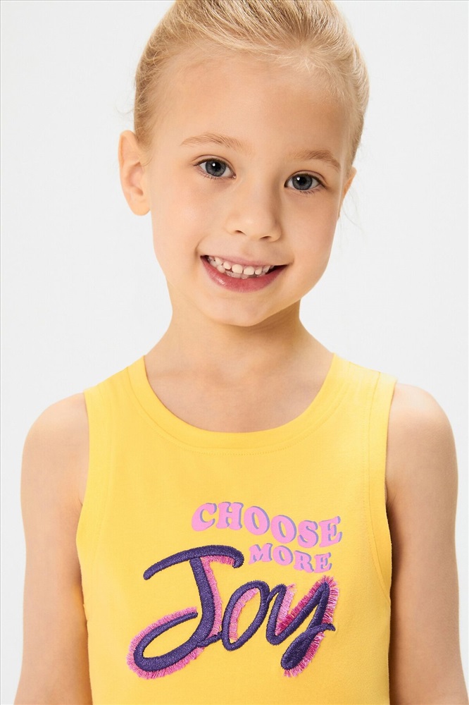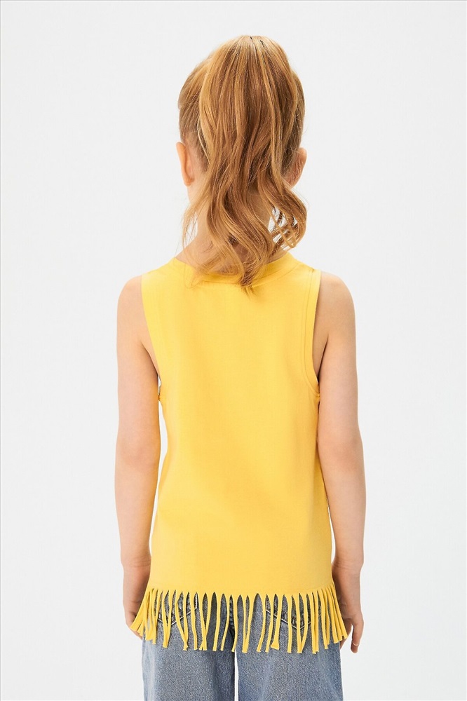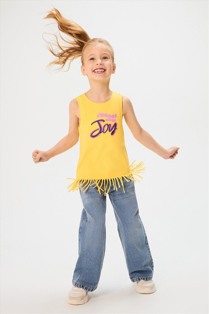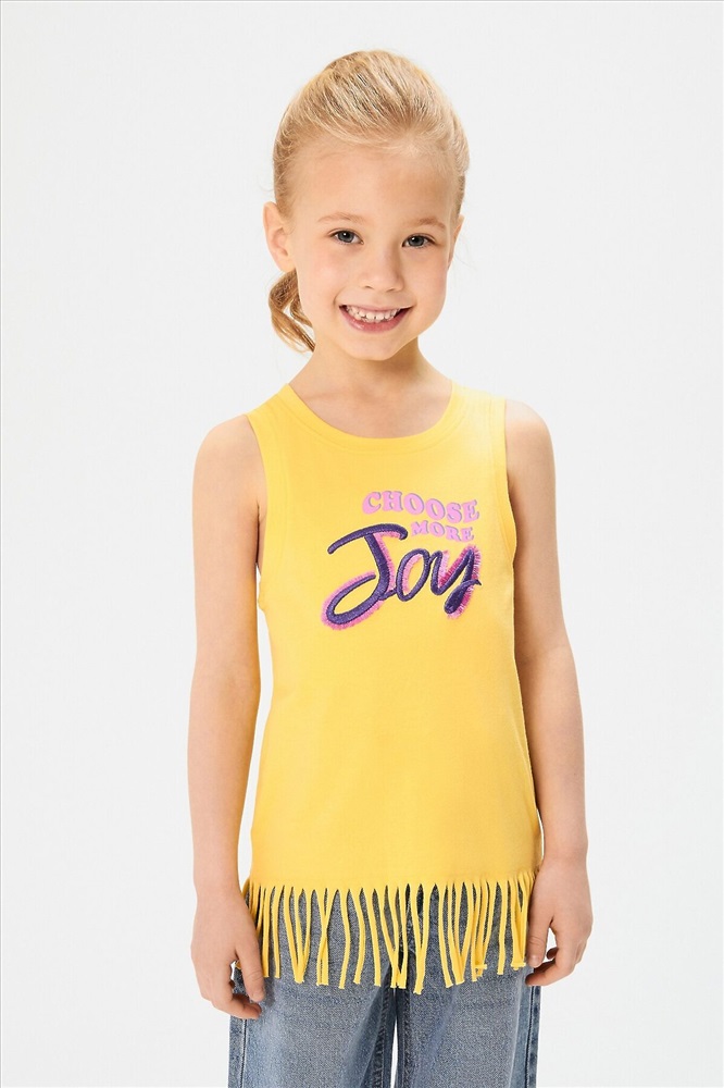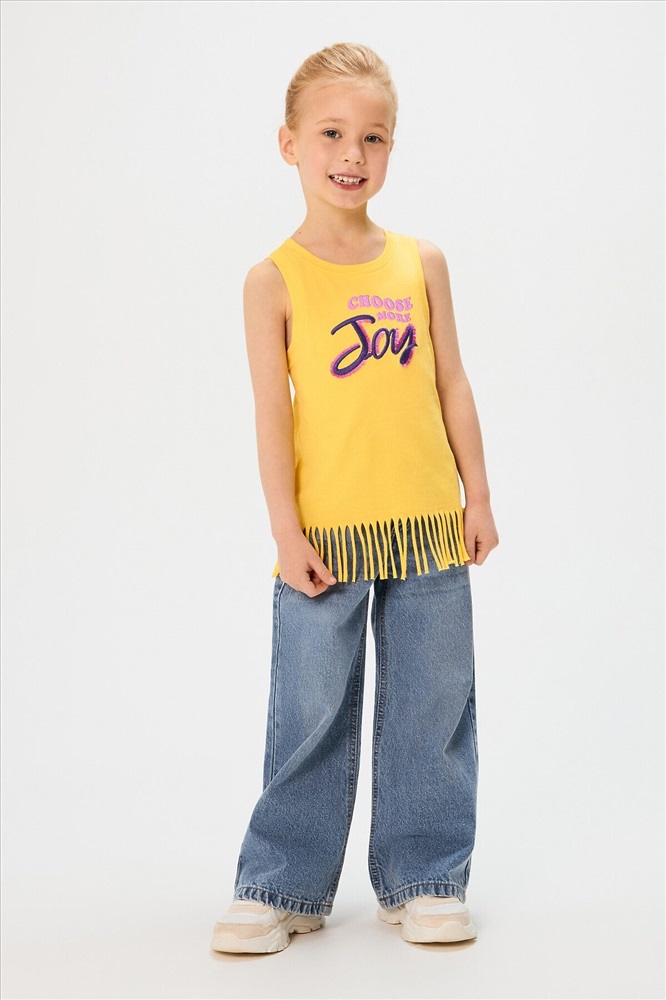 ID товара: 1039432 Состав: 95% Хлопок, 5% Полиуретан Сезон: Весна/Лето Длина: Средняя Фасон: Прямой Рукав: без рукавов Вырез горловины: Округлый Рисунок: Надпись Декоративные элементы: Бахрома Основная ткань: Хлопок Стиль: повседневный Страна бренда: Россия Страна производства: Китай Майка детская для девочек Solnce желтый Комментарии к товару