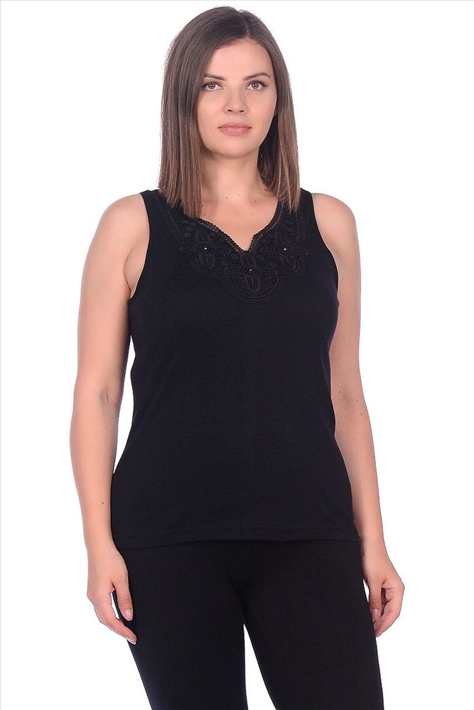 Майка женская. Прямой силуэт, широкие бретели. V-образный вырез горловины. Верх модели декорирован кружевом. Есть в разных цветах.