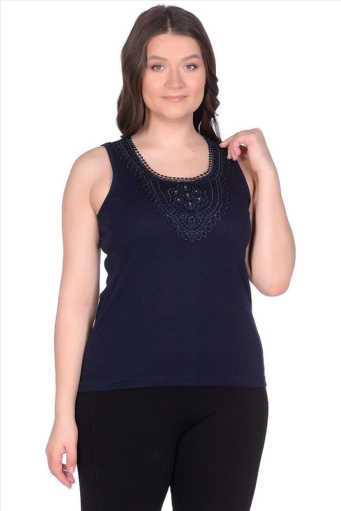 Майка женская. Прямой силуэт, широкие бретели. V-образный вырез горловины. Верх модели декорирован кружевом. Есть в разных цветах.
