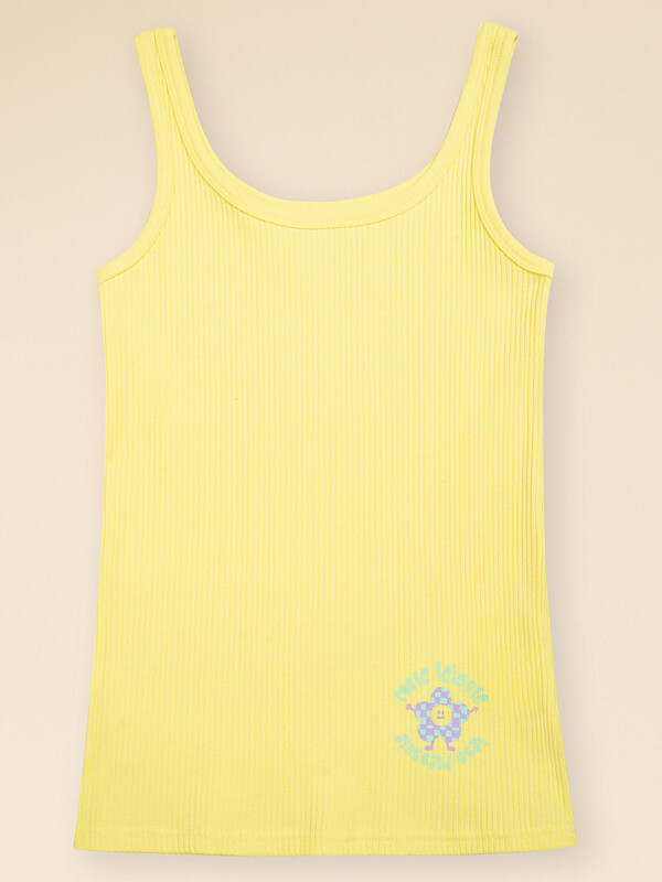 Если вы находитесь в поисках красивого и комфортного белья для своей дочки, обратите внимание на нашу изящную майку из модной ткани в рубчик для девочки. Модель выполнена из кашкорсе с высоким содержанием хлопка — изделие мягкое, воздухопроницаемое, кожа ребёнка дышит. Эластан в составе помогает майке сохранять великолепную форму, даже при частых стирках. Горловина и проймы обработаны эластичным пайпингом в тон — они не растягиваются, остаются в первозданном виде долго. Модель комфортно сидит по фигуре, подходит для носки под блузкой, джемпером, платьем. Изделие представлено в двух цветах. Классический белый вариант универсален, его можно надеть под белую блузку. Интересный бледно-желтый смотрится очень нежно и понравится любой девочке. Майку украшает забавный принт с позитивной надписью. Перевод принта: "Больше досуга, меньше давления".  Принт мягкий и стойкий, замечательно переносит стирки. Отличный выбор для повседневной носки, сна, отдыха. Станет замечательным подарком, который способен вызвать искреннюю