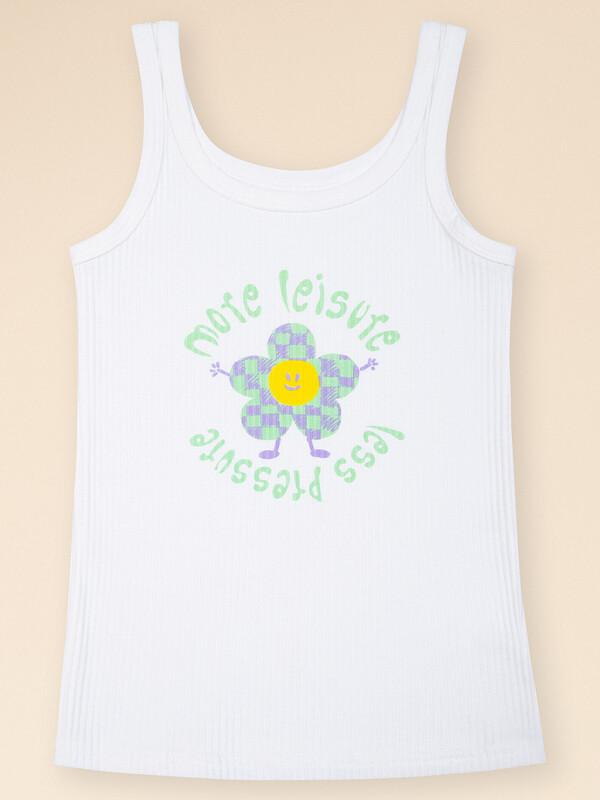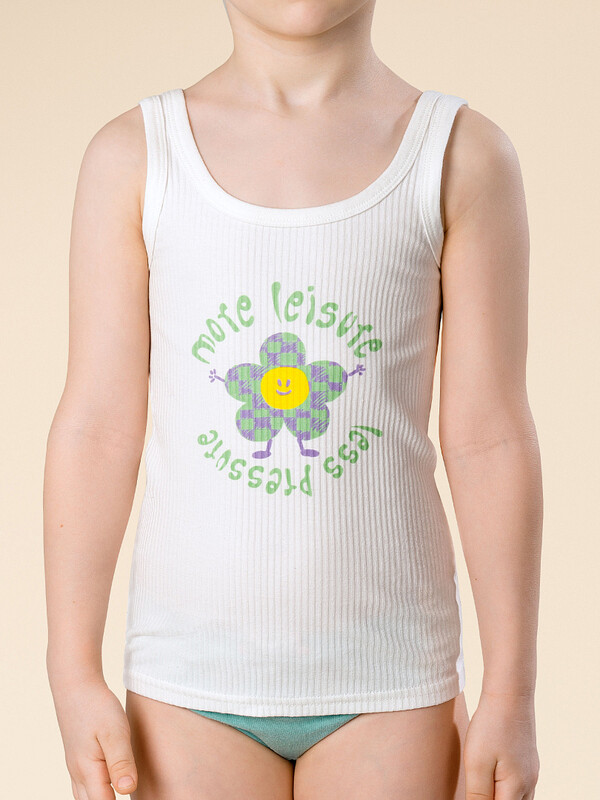 Состав: 95%хлопок 5%эластан Если вы находитесь в поисках красивого и комфортного белья для своей дочки, обратите внимание на нашу изящную майку из модной ткани в рубчик для девочки. Модель выполнена из кашкорсе с высоким содержанием хлопка — изделие мягкое, воздухопроницаемое, кожа ребёнка дышит. Эластан в составе помогает майке сохранять великолепную форму, даже при частых стирках. Горловина и проймы обработаны эластичным пайпингом в тон — они не растягиваются, остаются в первозданном виде долго. Модель комфортно сидит по фигуре, подходит для носки под блузкой, джемпером, платьем. Изделие представлено в двух цветах. Классический белый вариант универсален, его можно надеть под белую блузку. Интересный бледно-желтый смотрится очень нежно и понравится любой девочке. Майку украшает забавный принт с позитивной надписью. Перевод принта: "Больше досуга, меньше давления". Принт мягкий и стойкий, замечательно переносит стирки. Отличный выбор для повседневной носки, сна, отдыха. Станет замечательным подарком, который способен вызвать искреннюю Комментарии к товару