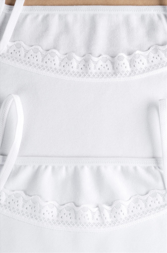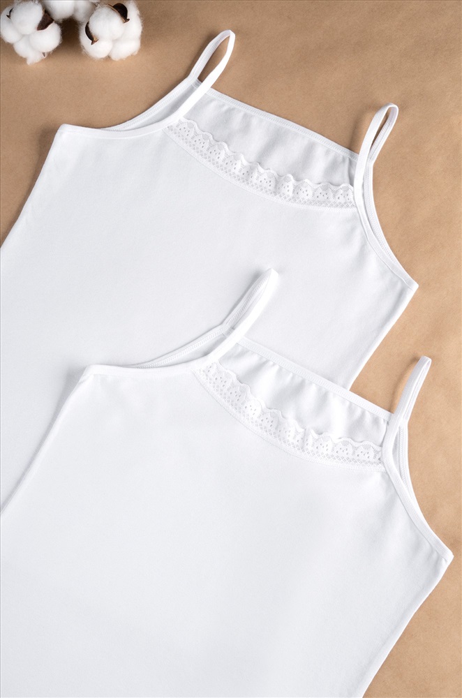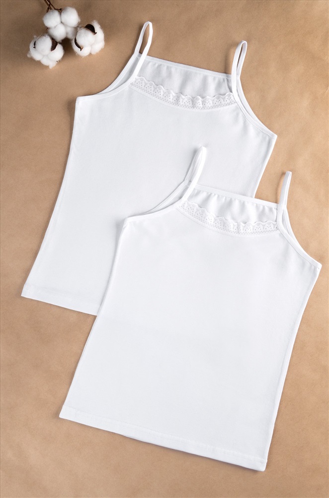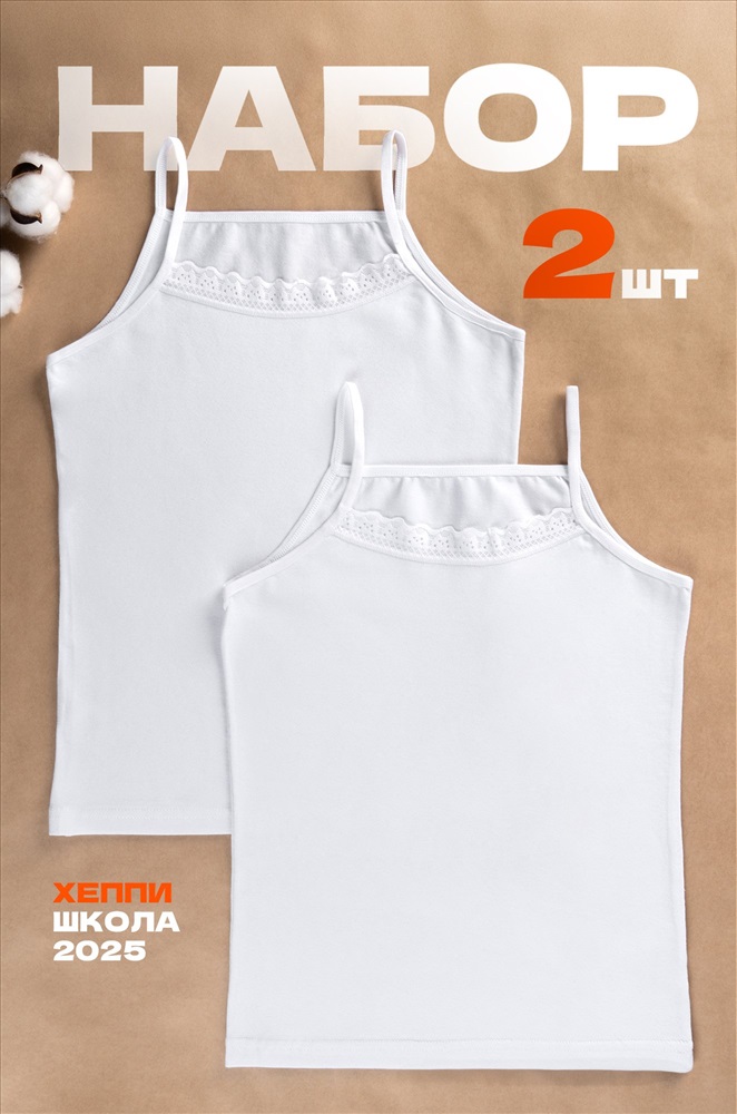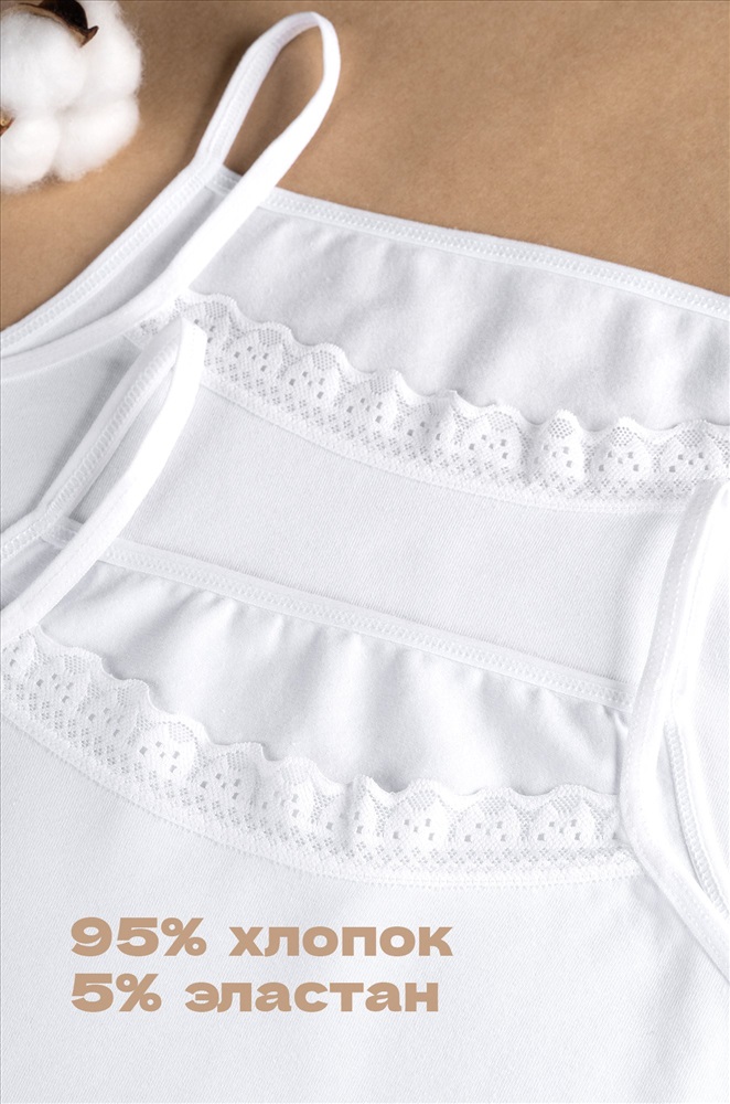 Преимущества: – натуральный хлопок с добавлением эластана — мягкость и комфорт; – трикотажный материал держит форму и приятно ощущается на теле; – кружево с милым узором добавляет нежности; – всесезонное использование — подходит и для детей, и для подростков; – хлопковый бельевой комплект, 2 штуки — удобно для дома и для школы. Классическая майка имеет прямой силуэт и тонкие лямки. Базовые нательные маечки остаются удобными и красивыми и не теряют форму после стирок. Комментарии к товару