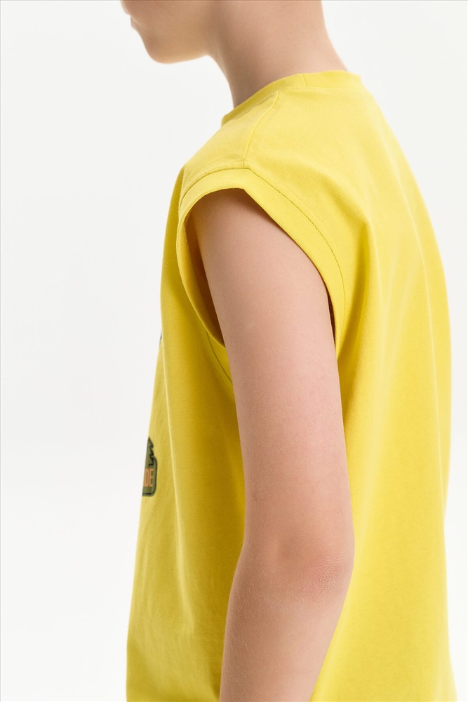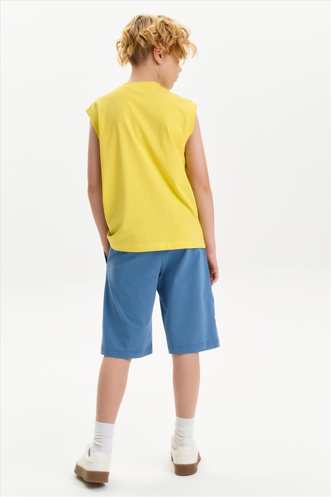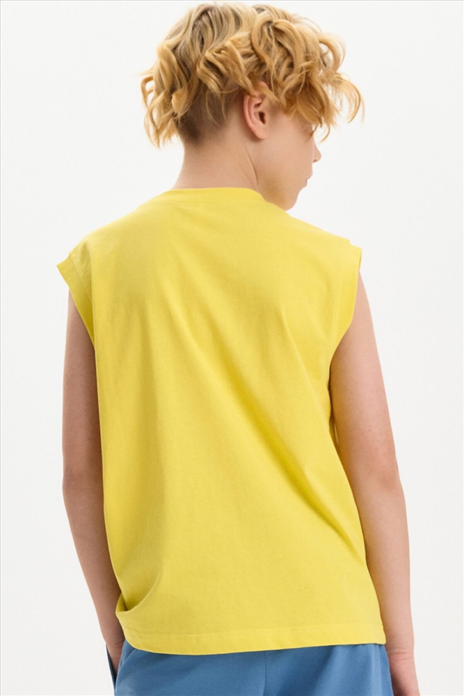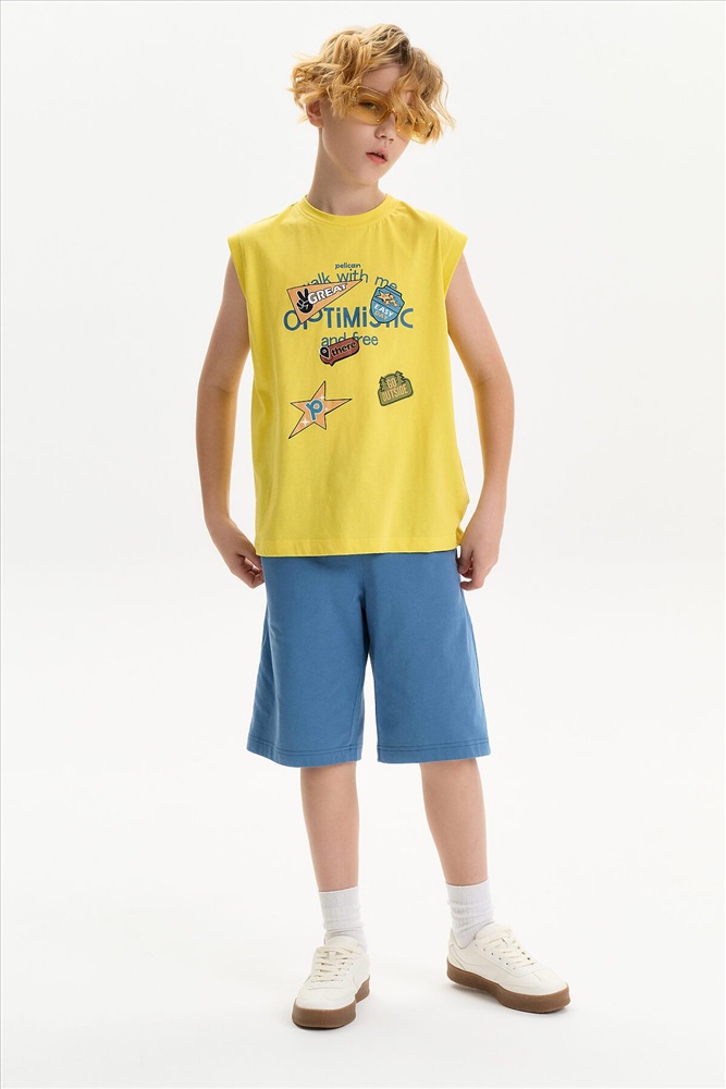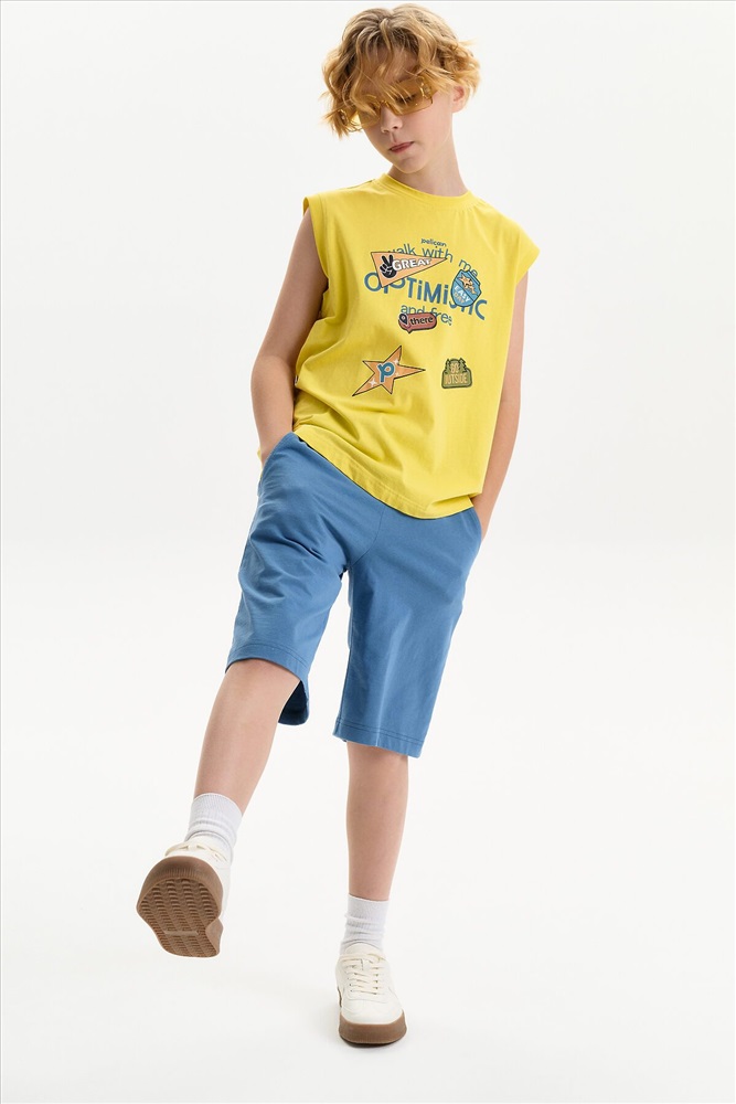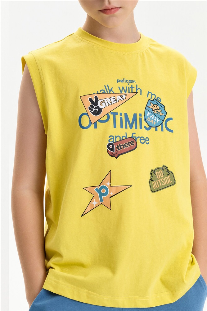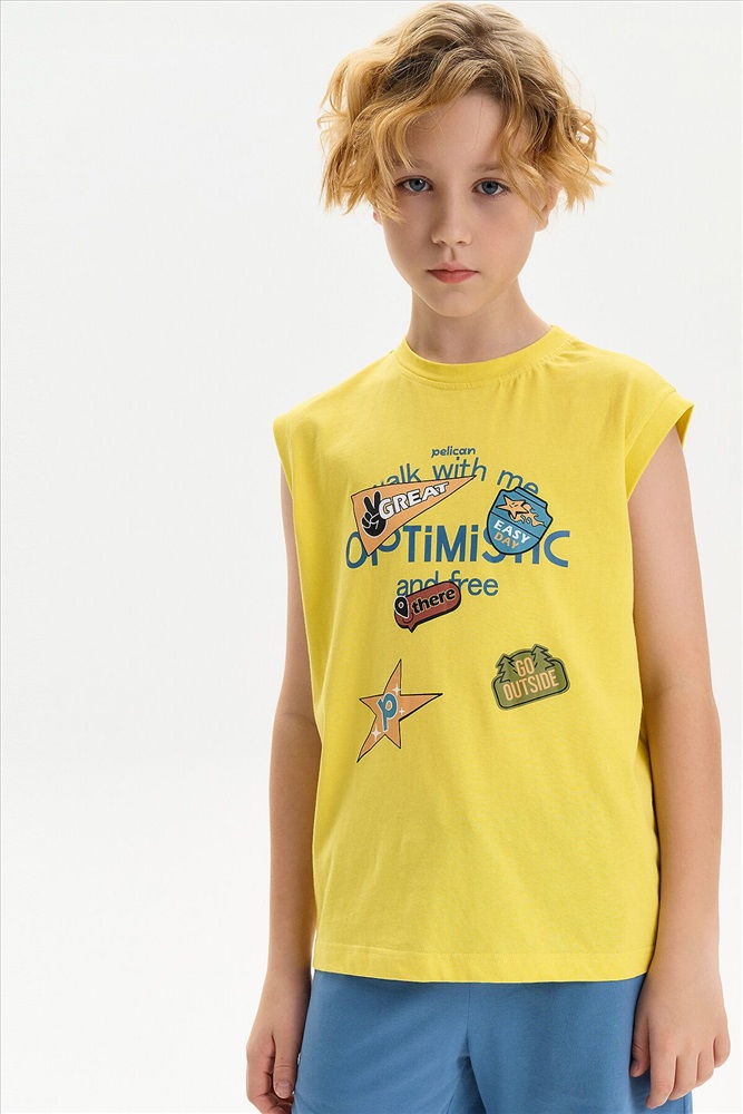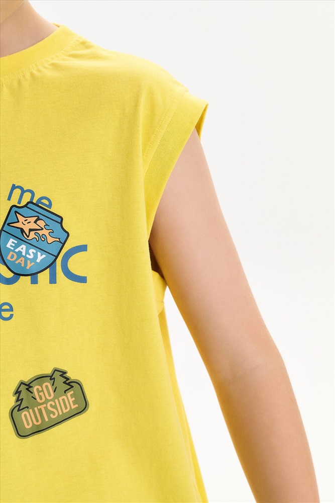 Майка для мальчика прямого силуэта увеличенного объема, с чуть расширенным плечевым поясом, с углубленной проймой, удлиненная. Вырез горловины обработан эластичной тканью — она прекрасно держит форму, не растягивается, при этом ребёнку удобно надевать и снимать майку. Перевод: идём со мной: Оптимистичный и свободный.