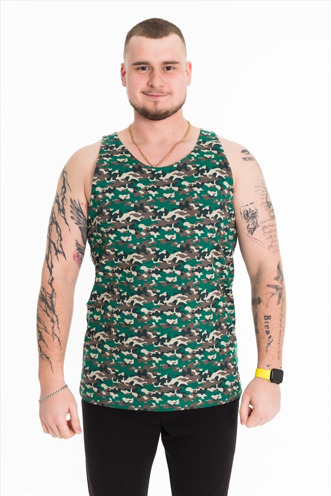 Сезон: Всесезонный Силуэт: Облегающий Состав: Хлопок 100% Цвет Номенклатуры: хаки Классическая мужская майка с округлым вырезом горловины, выполнена из высококачественного полотна (камуфляж). 100% хлопок приятный для тела, хорошо впитывает влагу и обеспечивает воздухопроницаемость. Изделие подходит для ежедневного использования и занятий спортом. Комментарии к товару