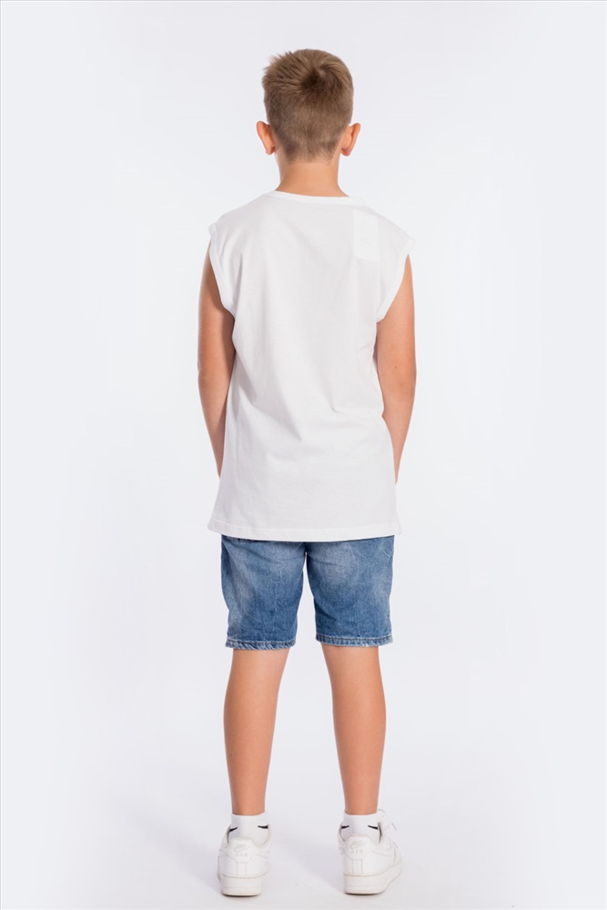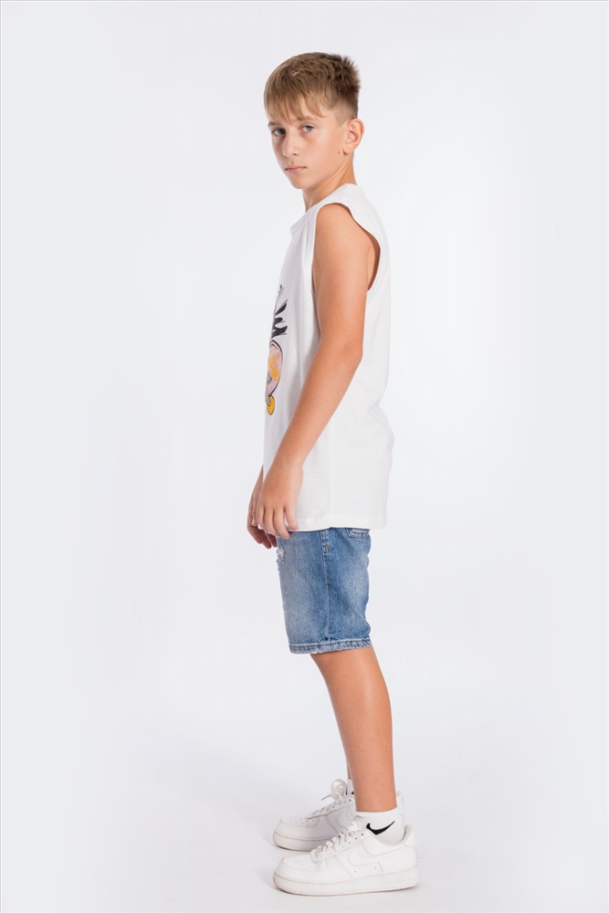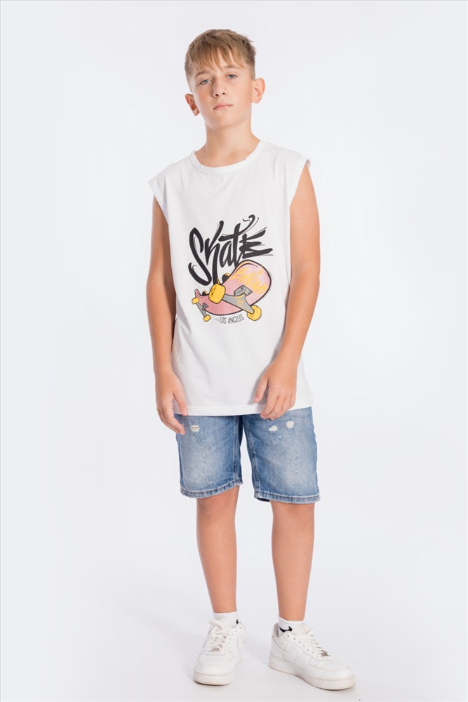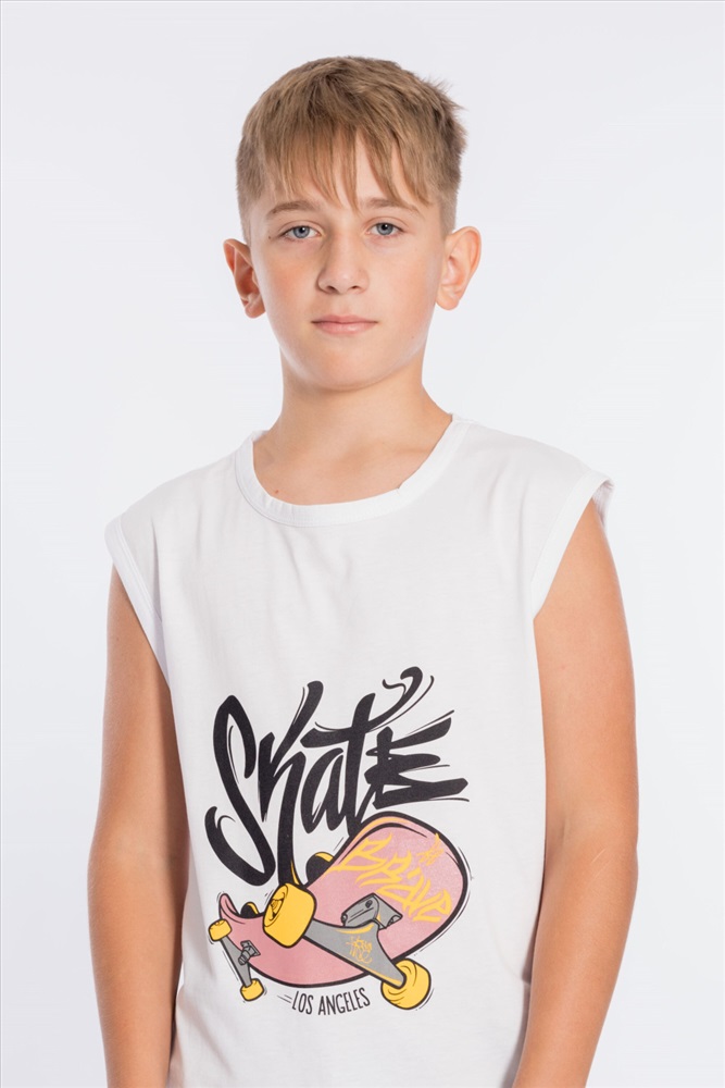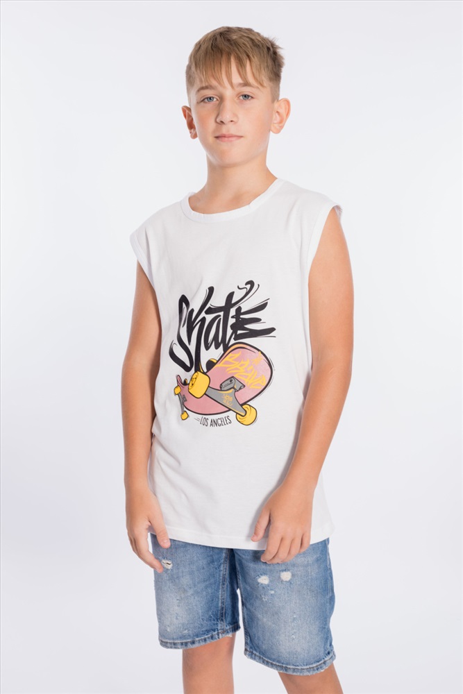 Сезон: Всесезонный Силуэт: Свободный Состав: Хлопок 100% Цвет Номенклатуры: белый Майка из однотонной кулирки с принтом спереди. Комментарии к товару