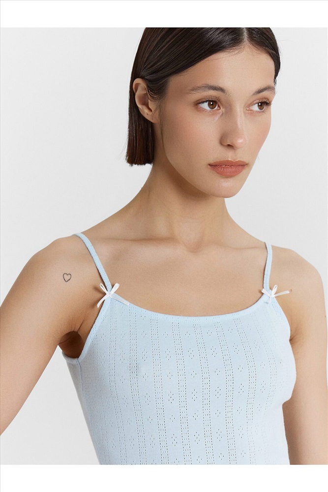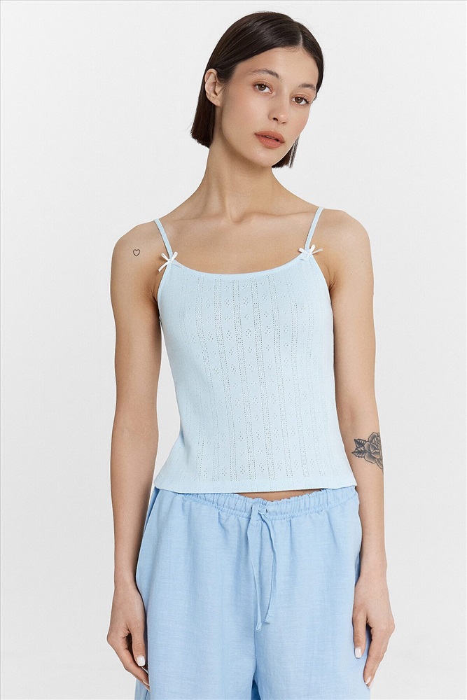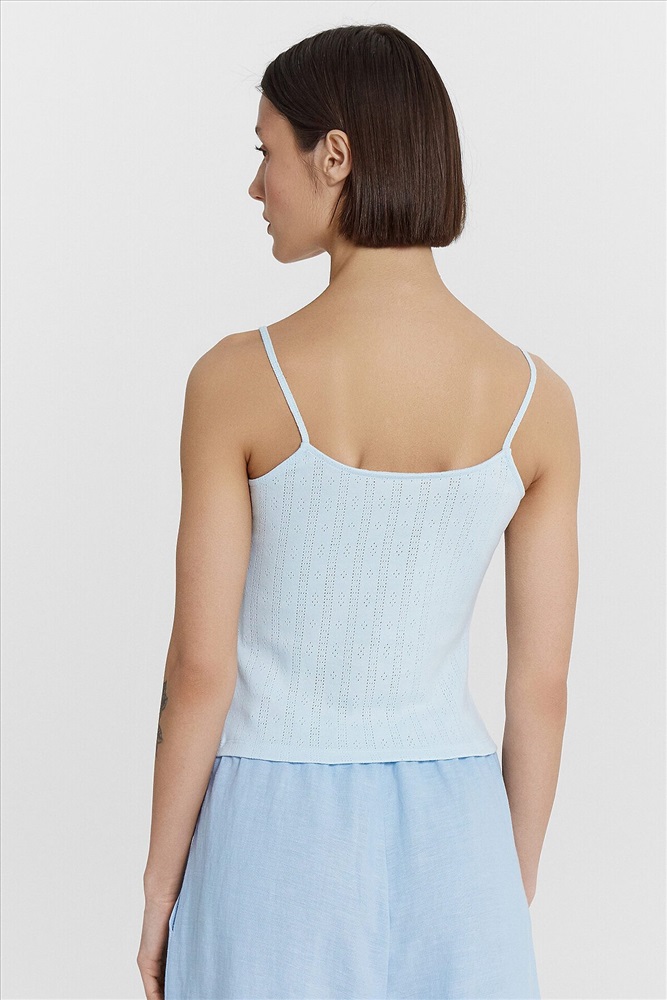 Топ прилегающего силуэта. Верхний край изделия обработан бейкой, переходящей в бретели. Низ изделия обработан в подгибку.