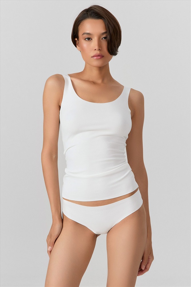 Базовая однотонная женская майка из трикотажного интерлока. Особенность этой модели – необработанные "сырые" срезы на проймах и круглом вырезе. Универсальная модель!