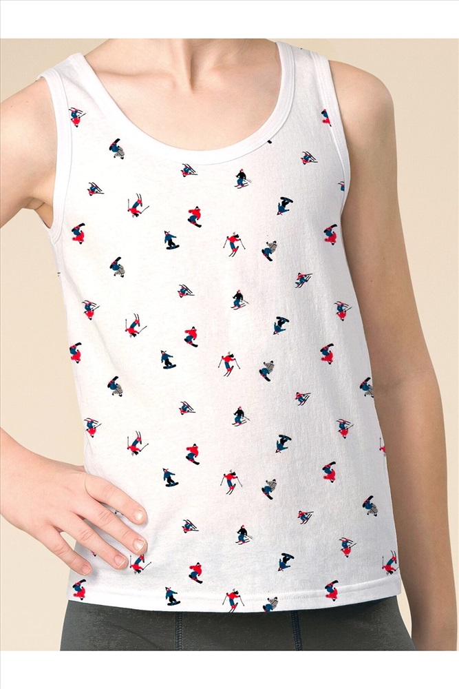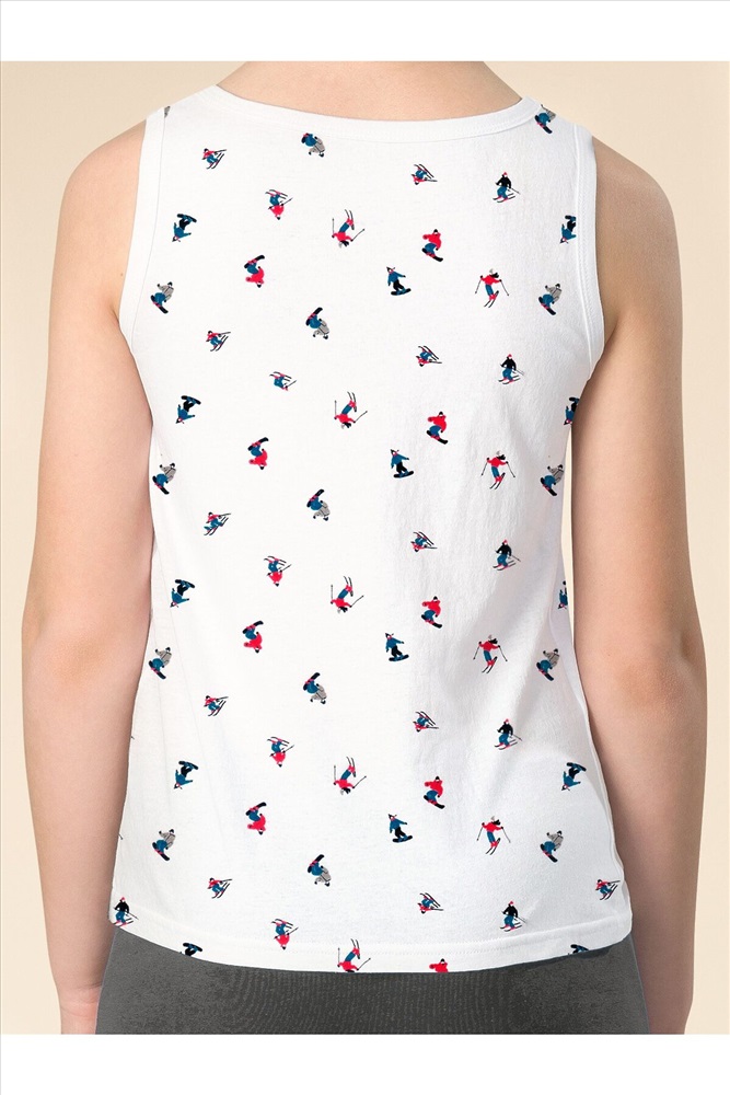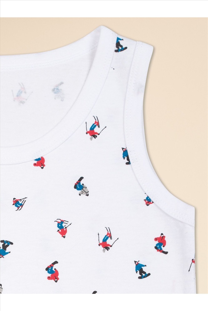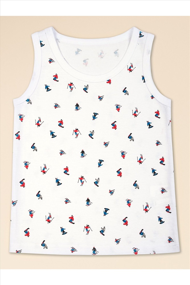 Белая майка для мальчика с олловер-принтом и круглым вырезом горловины станет комфортным, базовым вариантом белья. Изделие выполнено из мягкого материала со 100% содержанием хлопка. Белье приятно прилегает к телу, не вызывает раздражений за счет гипоаллергенного состава ткани. Майка из хлопка хорошо пропускает воздух, впитывает влагу, отводя ее от тела, позволяя мальчику свободно двигаться, играть. Кромка горловины и плеч аккуратно прошита мягкой полоской ткани - бейкой. В хлопковом нижнем белье высокого качества ребенок будет чувствовать себя комфортно и безопасно. Детская и подростковая майка из хлопка - это базовая одежда в гардеробе каждого ребенка. Высокое качество материала и пошива наделяет изделие долгим сроком службы с сохранением привлекательного внешнего вида. Благодаря мягкой ткани и удобному крою изделие легко сочетать с футболками, рубашками и свитерами. Белая майка для мальчика с мелким рисунком отлично подходит в качестве нательной одежды, варианта для сна, домашнего отдыха. Нужная вещь на все случаи жизни! Нательная майка украшена принтом лыжника, подходит для мальчика возраста садика, школы, а также подростка. Соберите комплект из хлопковой майки и трусов из представленной зимней коллекции в подарок на Новый год и Рождество для самых любимых!
