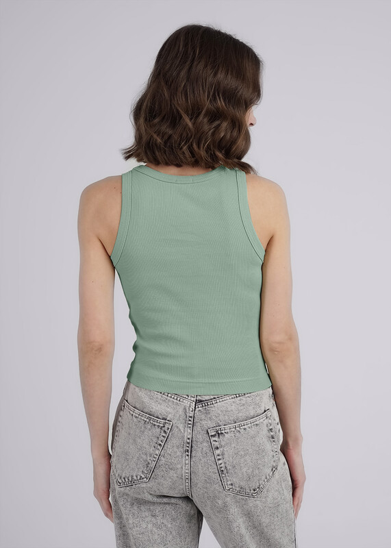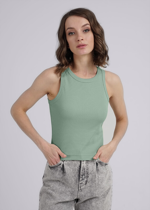 Майка из хлопкового трикотажного полотна кашкорсе. Умеренный объем. Узкая бретель, округлая горловина. По горловине и пройме окантовка. Производство Узбекистан.