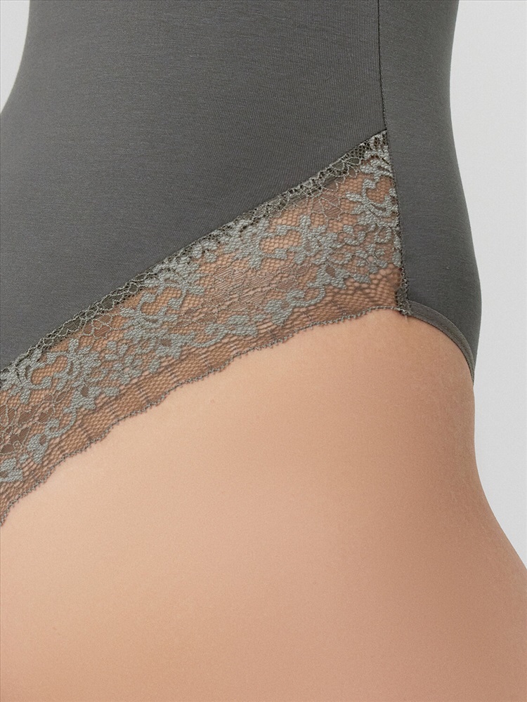 Боди женское из эластичного трикотажного кулирного полотна. Задняя деталь, силуэта слипы, декорирована эластичным кружевом по низу. Верхние срезы деталей переда и спинки обработаны обтачкой из кулирного полотна, с эластичной тесьмой 6 мм (жилка WT4-6, devsel 13460W) внутри. Нижний срез обтачки обработан эластичной тесьмой 20 мм (жилка 20 мм, WT4-20, devsel 13195W). Подкладка ластовицы из кулирного полотна. Застежка на 3 книппера по переднему срезу ластовицы. Нижние срезы боди обработаны эластичной тесьмой 6 мм (жилка WT4-6, devsel 13460W) с лицевой стороны, на плоскошовной машине. Бретель 15 мм (SWE2-15) с регулировкой по длине.