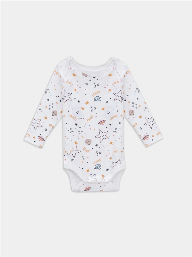 Круглая горловина с аккуратной бейкой из основного материала сохраняет форму даже после многочисленных стирок. Длинные рукава создают дополнительную защиту и уют, особенно в прохладное время года. Удобные застежки-кнопки по центру позволяют легко переодевать ребенка, не нарушая его покой.
