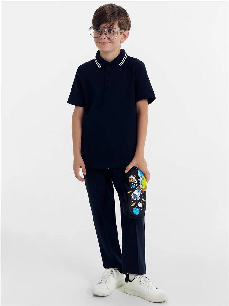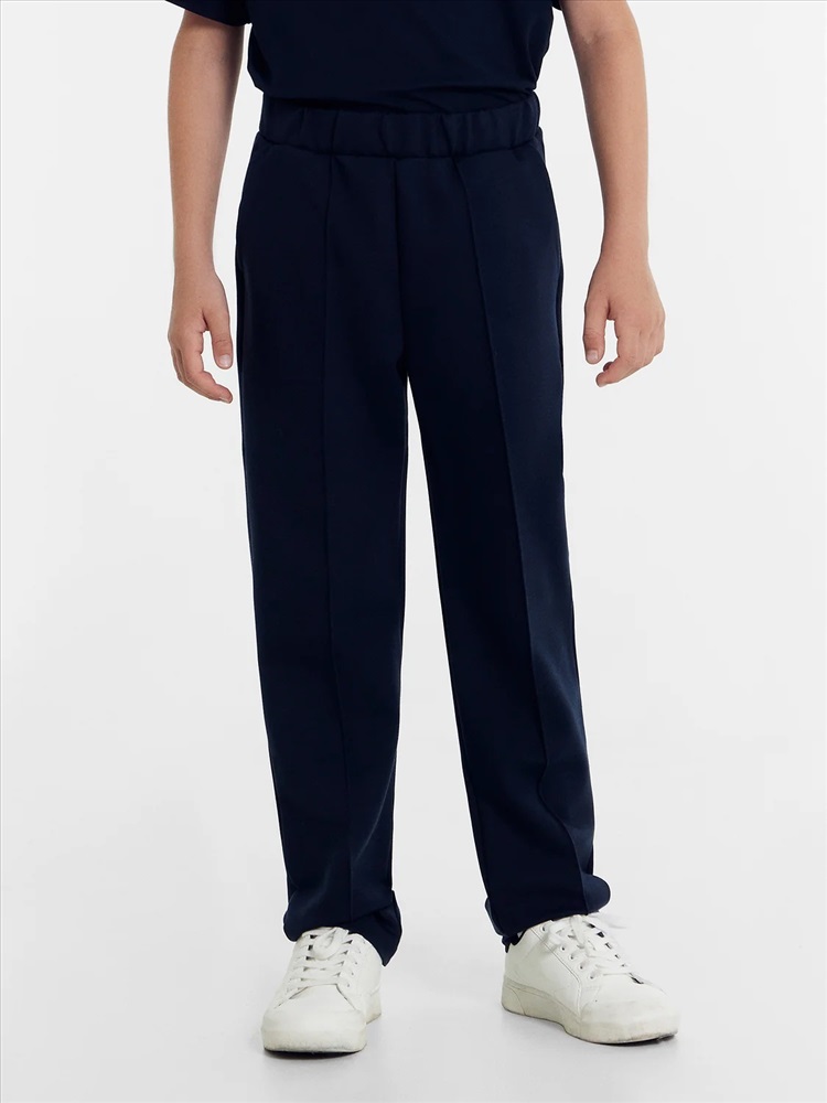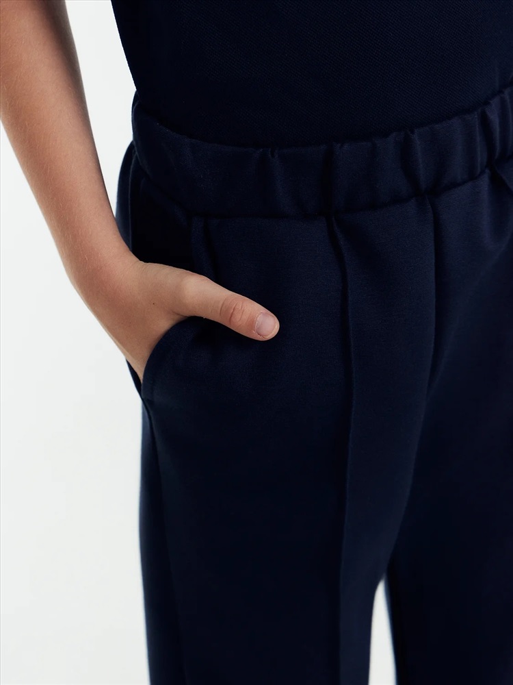 Брюки прямого силуэта из трикотажного полотна академик. Пояс с эластичной тесьмой внутри. Есть боковые карманы «хулиганы». Спереди брюки дополнены модными защипами. Штанины подогнуты. Для самых стильных мальчиков!