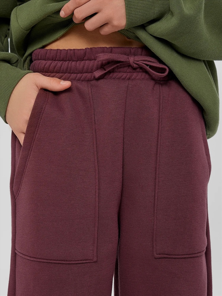 Посадка средняя. Пояс отрезной, внутрь пояса застрочена эластичная тесьма и шнур. По поясу идут две декоративные строчки. Боковые швы перенесены вперед. На передних деталях накладные карманы с наклонным входом от боковых швов. По низу изделия внутрь застрочена эластичная тесьма.