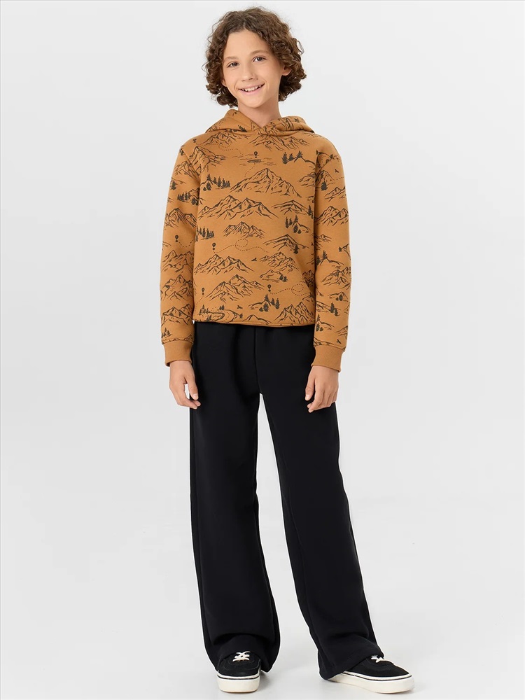 Брюки для мальчиков, прямого силуэта. Пояс цельнокройный с втачной эластичной тесьсьмой. Пояс прострочен двумя отделочными строчками. По переду обработаны карманы в швах. Низ брюк обработан швом в подгибку на двухигольной плоскошовной машине.