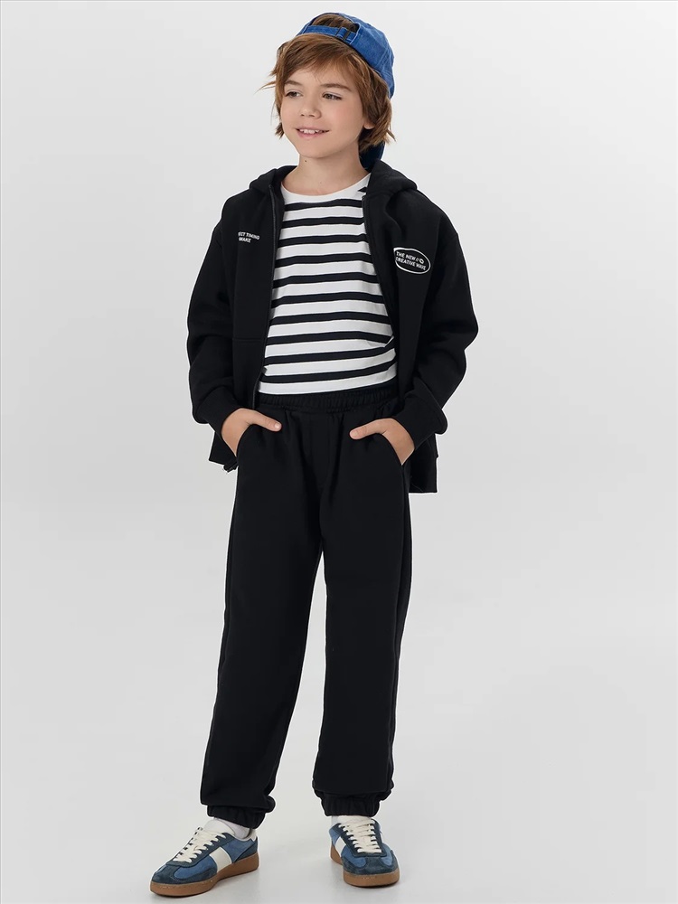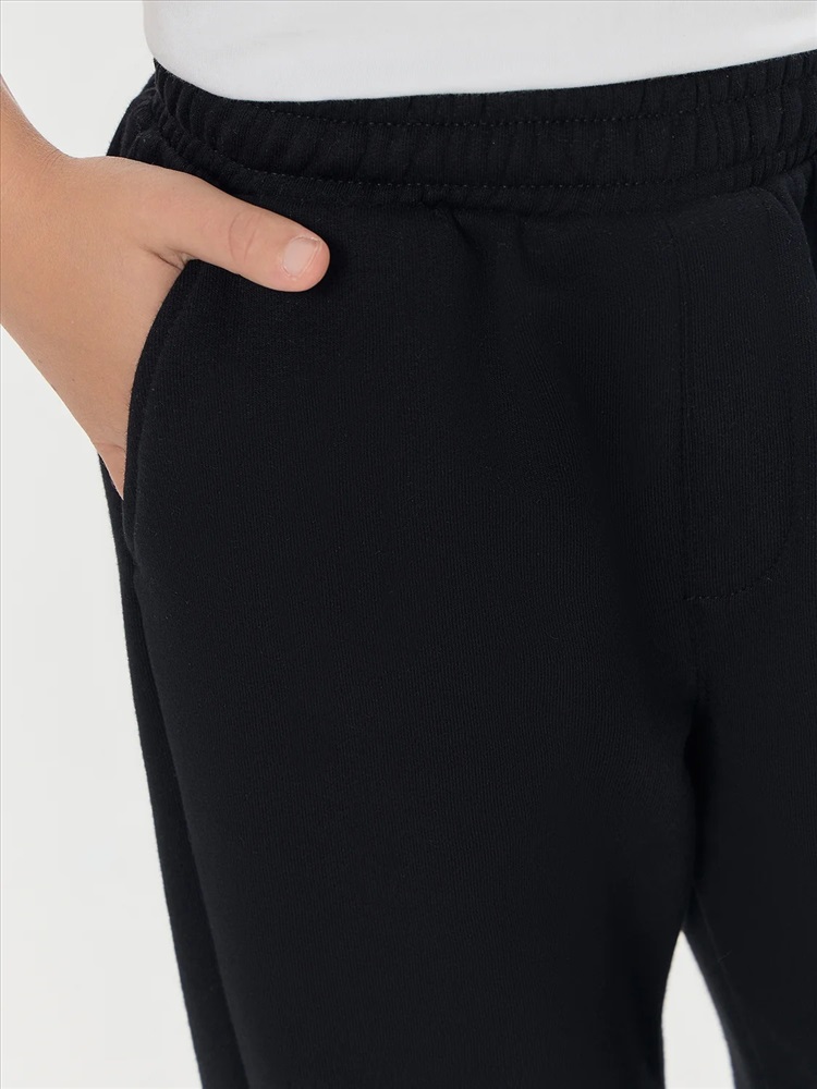 Брюки-джоггеры для мальчиков. Пояс отрезной с втачной эластичной тесьмой, внутри шнур. Пояс прострочен двумя отделочными строчками. По переду обработаны карманы с отрезным бочком. Низ брюк застрочен с эластичной тесьмой на двухигольной плоскошовной машине.