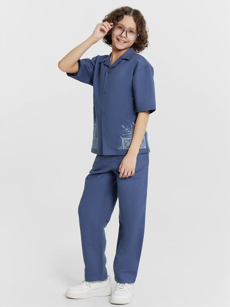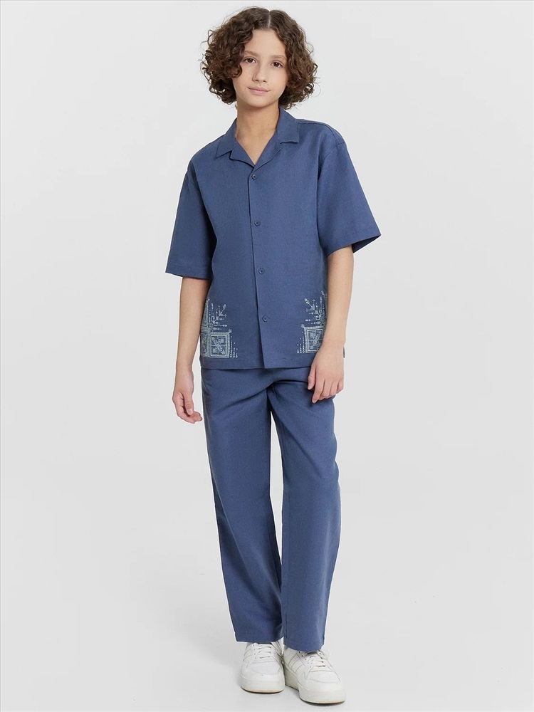 Брюки для мальчиков из ткани. Брюки длинные с классической линией талии. Силуэт прямой, брюки заужены немного к низу. Пояс цельнокроеный. Верхний срез брюк