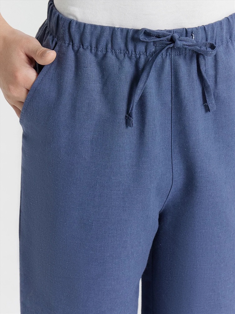 Низ брюк обработан швом в подгибку.