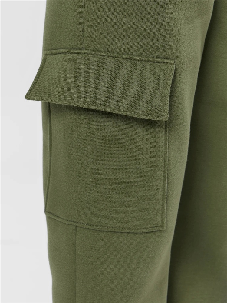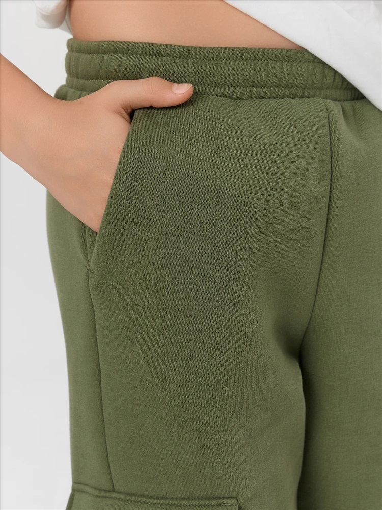 Брюки джогеры. Посадка средняя. На передних деталях карманы "хулиганы". Подкладка карманов из основного полотна. Пояс отрезной с эластичной тесьмой 40RV, отстрочен. Внутри в поясе пробиты петли и протянут шнур 10-PXC2. На боковых деталях накладные карманы с клапанами. Низ брюк обработан рибаной.