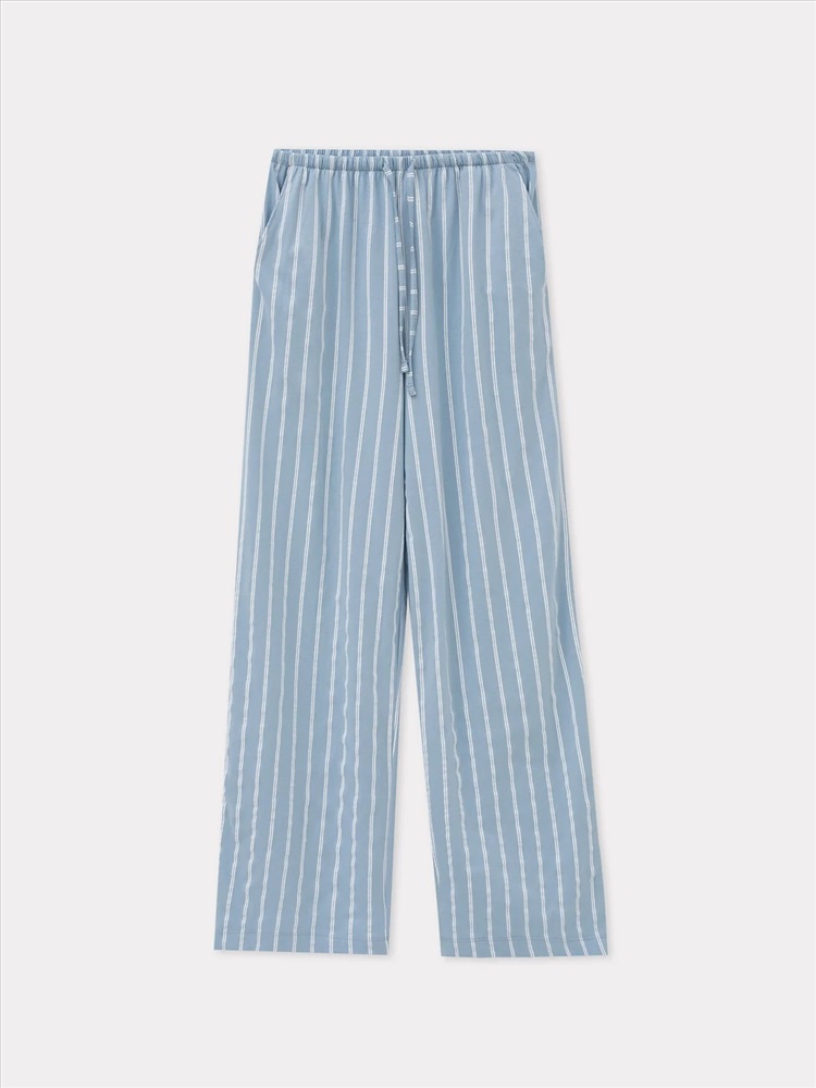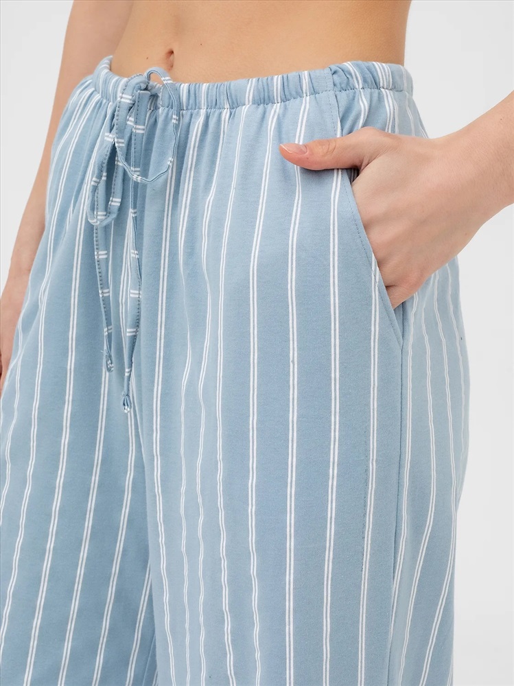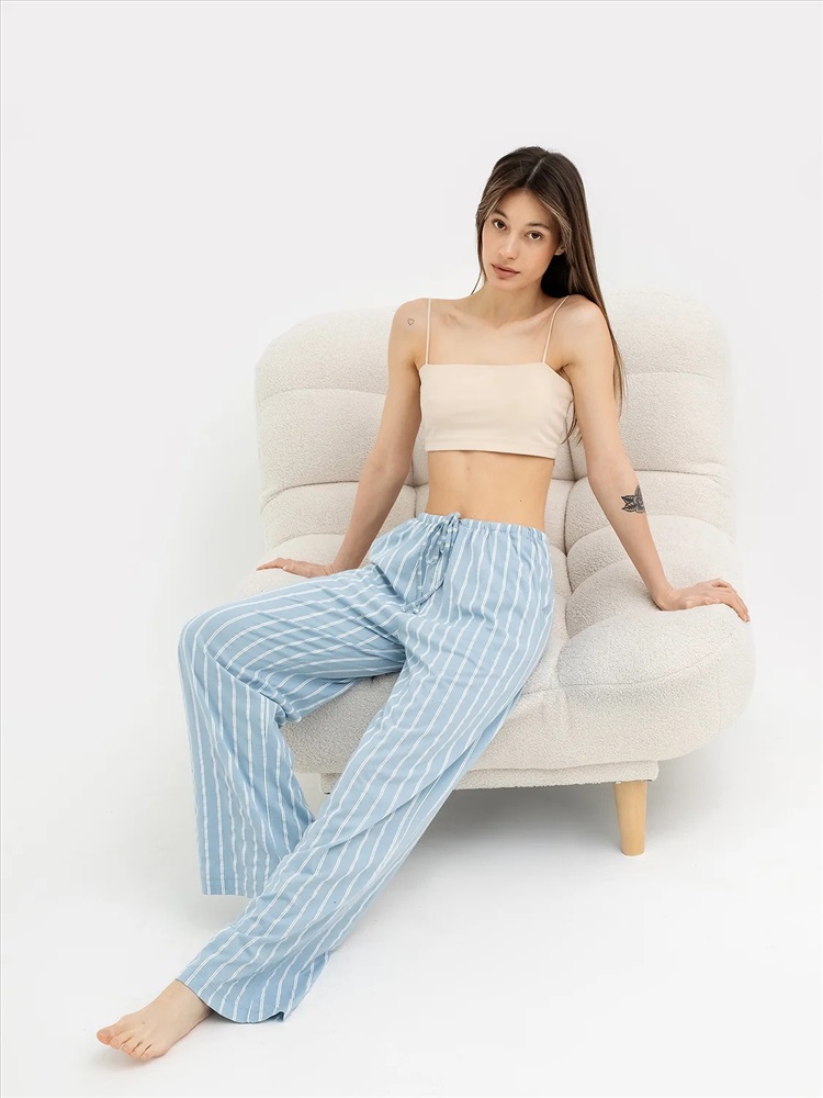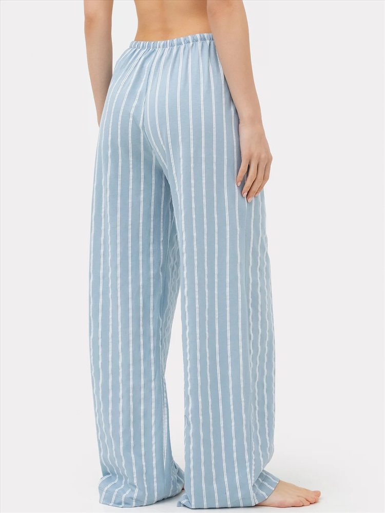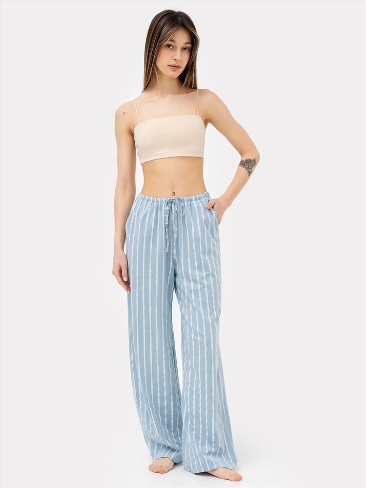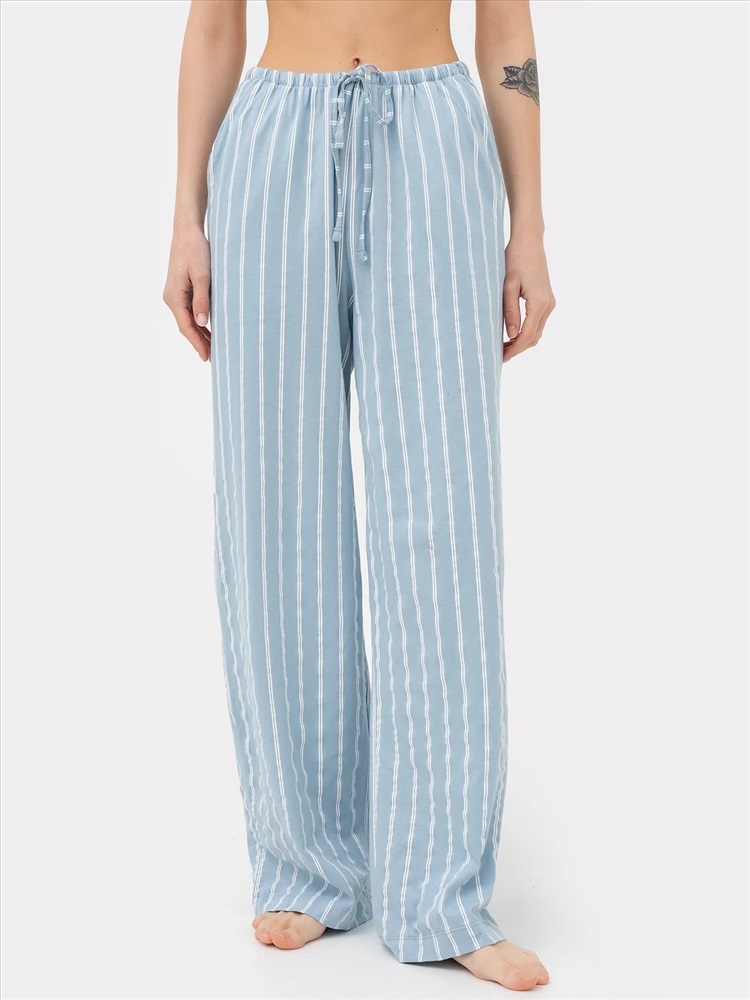 Брюки с посадкой на талии свободного силуэта. Пояс цельнокроеный с резиной внутри 20RV. По центру пояса пробиты петли, протянута бейка из основного полотна. На передних деталях карманы «хулиганы». Низ изделия застрочен швом в подгибку.