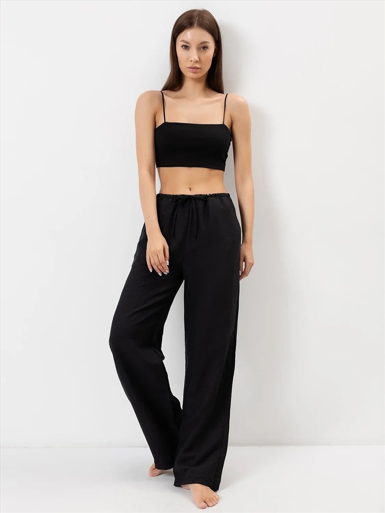 Брюки с посадкой на талии свободного силуэта. Пояс цельнокроеный с резиной внутри. По центру пояса пробиты петли, протянута бейка из основного полотна. На передних деталях карманы "хулиганы". Низ изделия застрочен швом в подгибку.