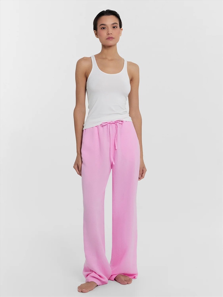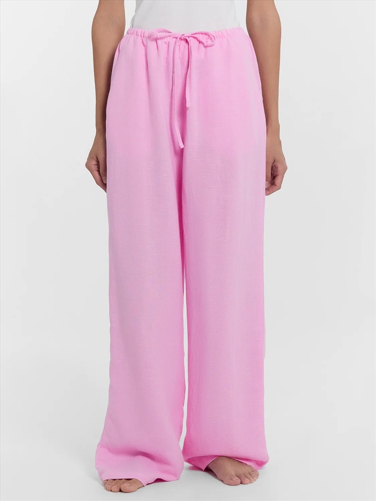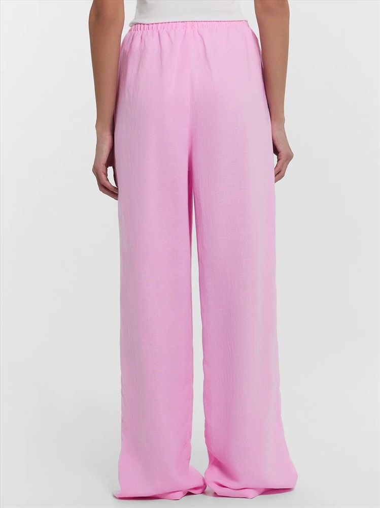 Брюки с посадкой на талии свободного силуэта. Пояс цельнокроеный с резиной внутри. По центру пояса пробиты петли, протянута бейка из основного полотна. На передних деталях карманы "хулиганы". Низ изделия застрочен швом в подгибку.