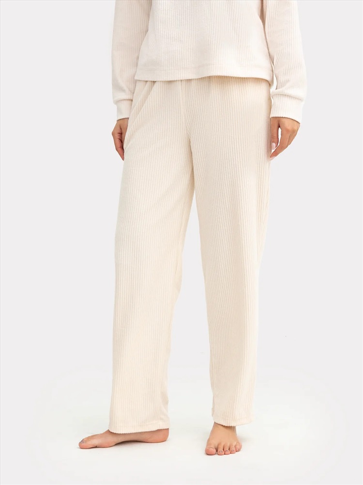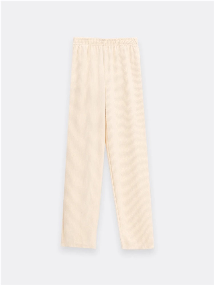Посадка брюк средняя. Пояс цельнокроеный с эластичной тесьмой внутри. Низ брюк обработан в подгибку.