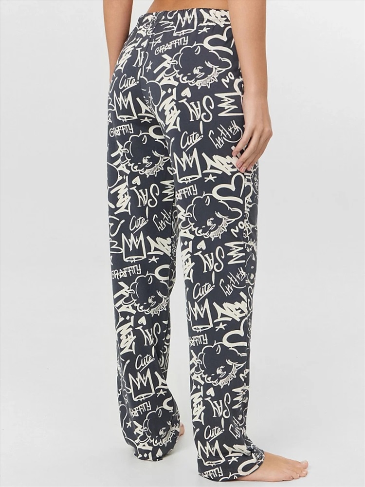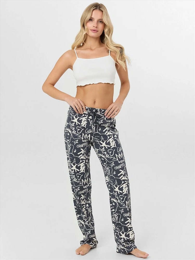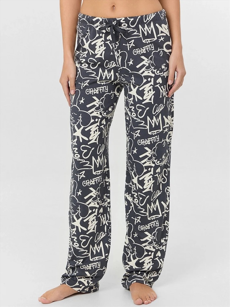 Брюки прямого силуэта, немного заужены к низу. Пояс цельнокроеный с резиной внутри 30RV. По центру пояса пробиты петли, протянута хб тесма 10мм. Низ брюк обработан в подгибку.