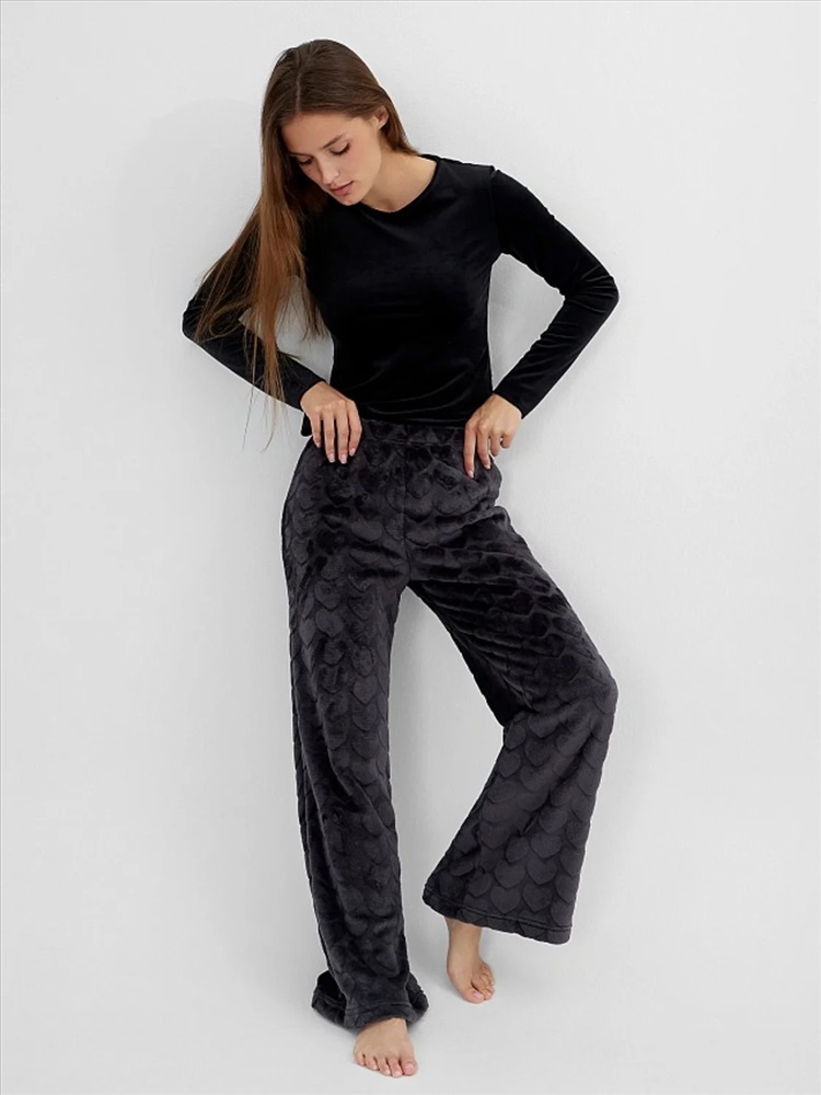 Женские домашние брюки — это уют и элегантность для вашего отдыха. Модель выполнена из мягкого трикотажа с меховым ворсом, который обеспечивает тепло и нежное прикосновение к коже. Прямой свободный крой со средней посадкой и эластичным поясом на широкой резинке гарантирует комфорт без давления, идеально адаптируясь к фигуре. Аккуратная обработка низа сохраняет форму брюк даже после множества стирок.