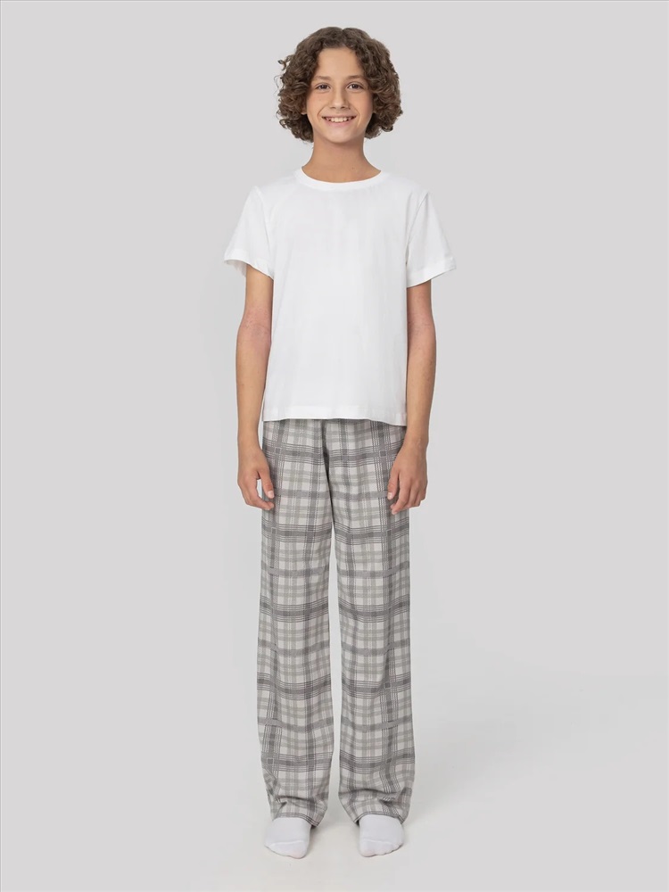 Брюки домашние для мальчиков, длинные и прямые. Детали переда и сидения соеденены боковым швом. Пояс цельнокроеный с эластичной тесьмой внутри (внутрення резина Rv30), ширина 30 мм.