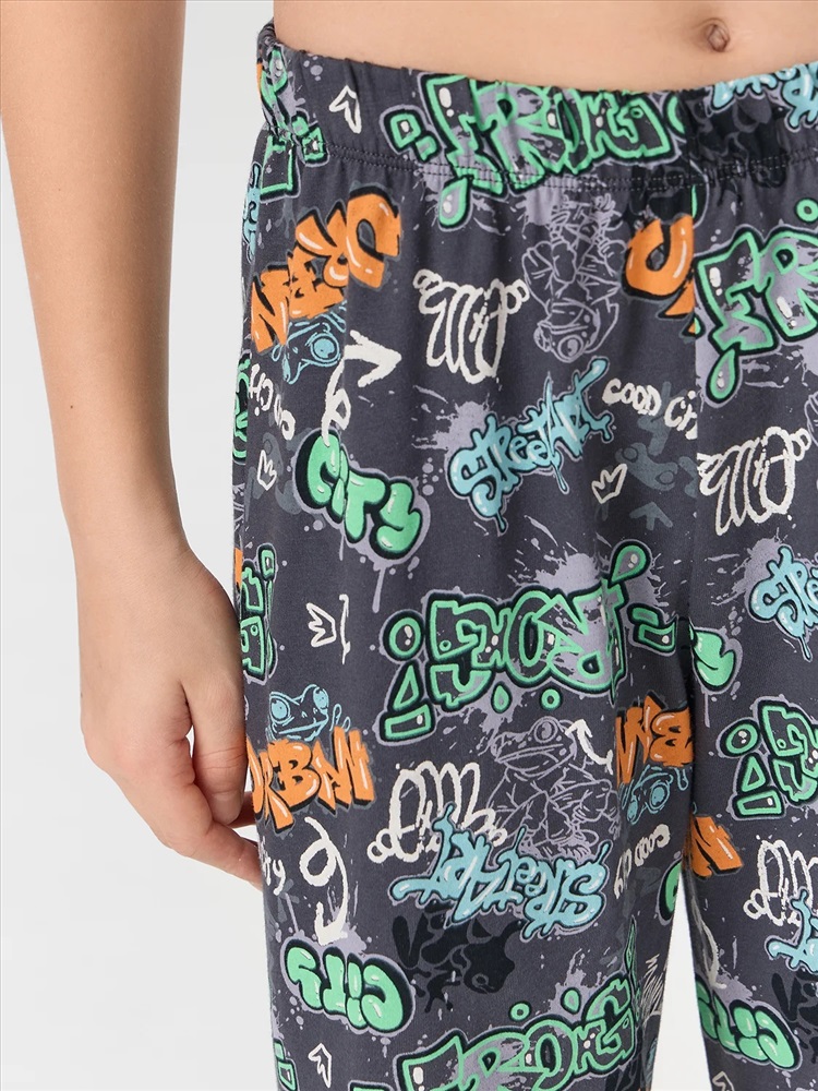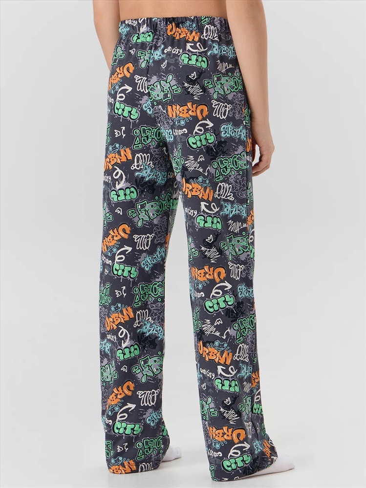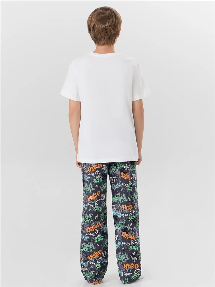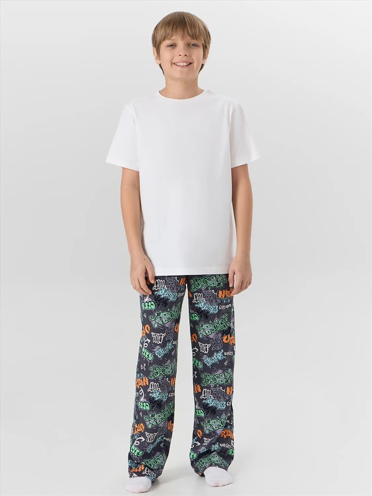 Брюки домашние для мальчиков, длинные и прямые. Детали переда и сидения соеденены боковым швом. Пояс цельнокроеный с эластичной тесьмой внутри (внутрення резина Rv30), ширина 30 мм.