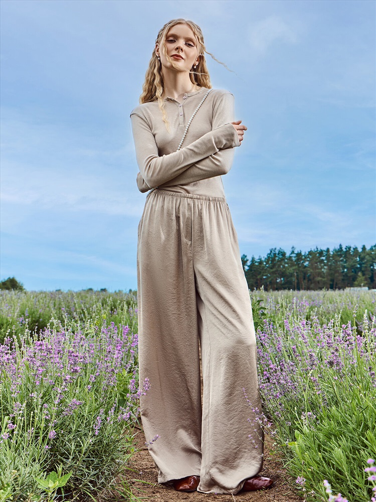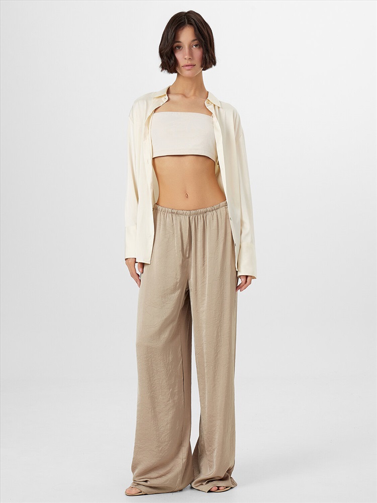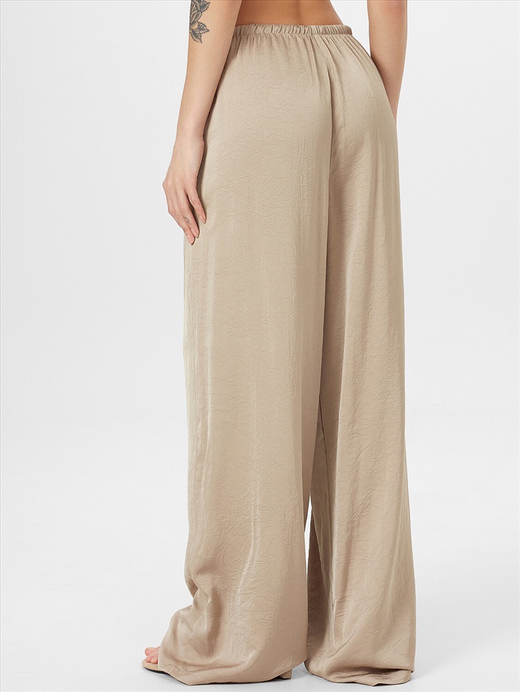Женские прямые свободные брюки со средней посадкой – отличный выбор для стильного и комфортного образа. Эластичный пояс обеспечивает удобную посадку, а боковые карманы добавляют практичности. Нижние срезы аккуратно обработаны швом вподгибку, что придаёт брюкам завершённый и аккуратный вид. Эта модель выполнена из нежного струящегося материала с добавлением вискозы, которая не только приятно ощущается на коже, но и красиво подчеркивает изящные линии фигуры. Вискоза добавляет брюкам легкость и воздушность, делая их идеальными для теплой погоды.