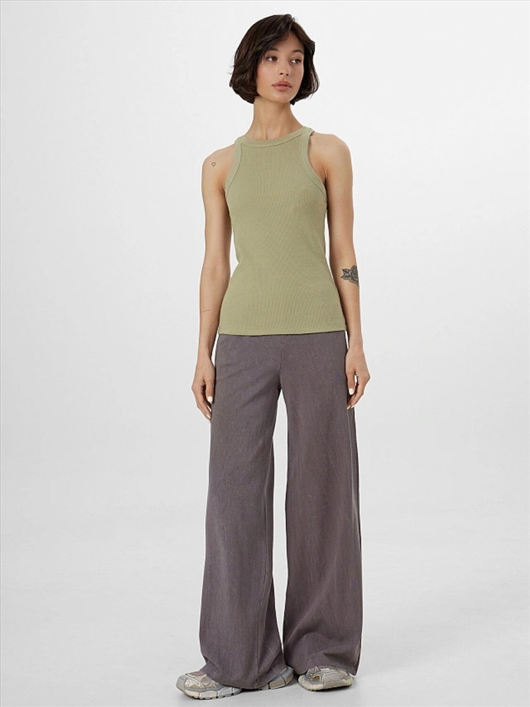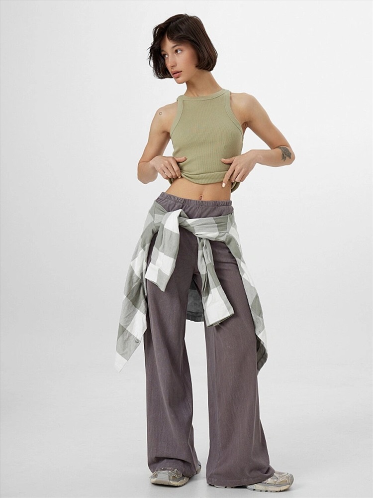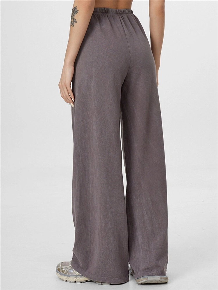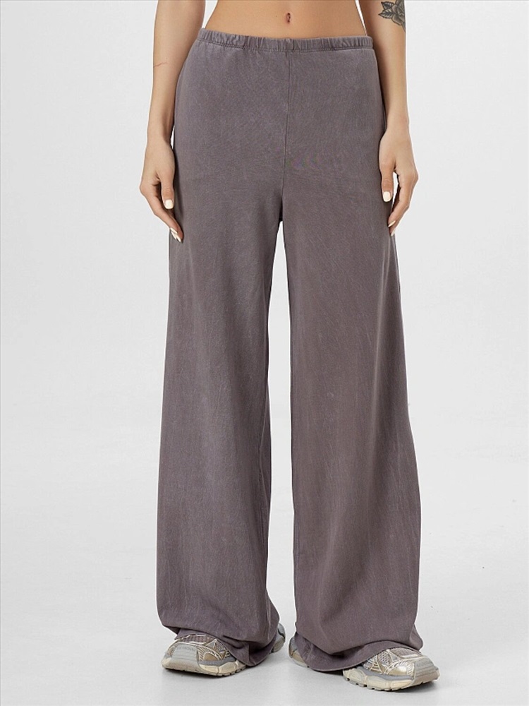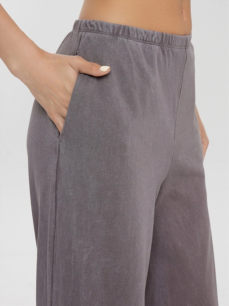Брюки прямые, свободного силуэта. Посадка средняя, сиденье опущено. Пояс цельнокроеный с эластичной тесьмой внутри (вн. 20мм 20RV). В боковых швах обработаны карманы. Подкладка кармана из основного полотна. Нижние срезы обработаны швом вподгибку.