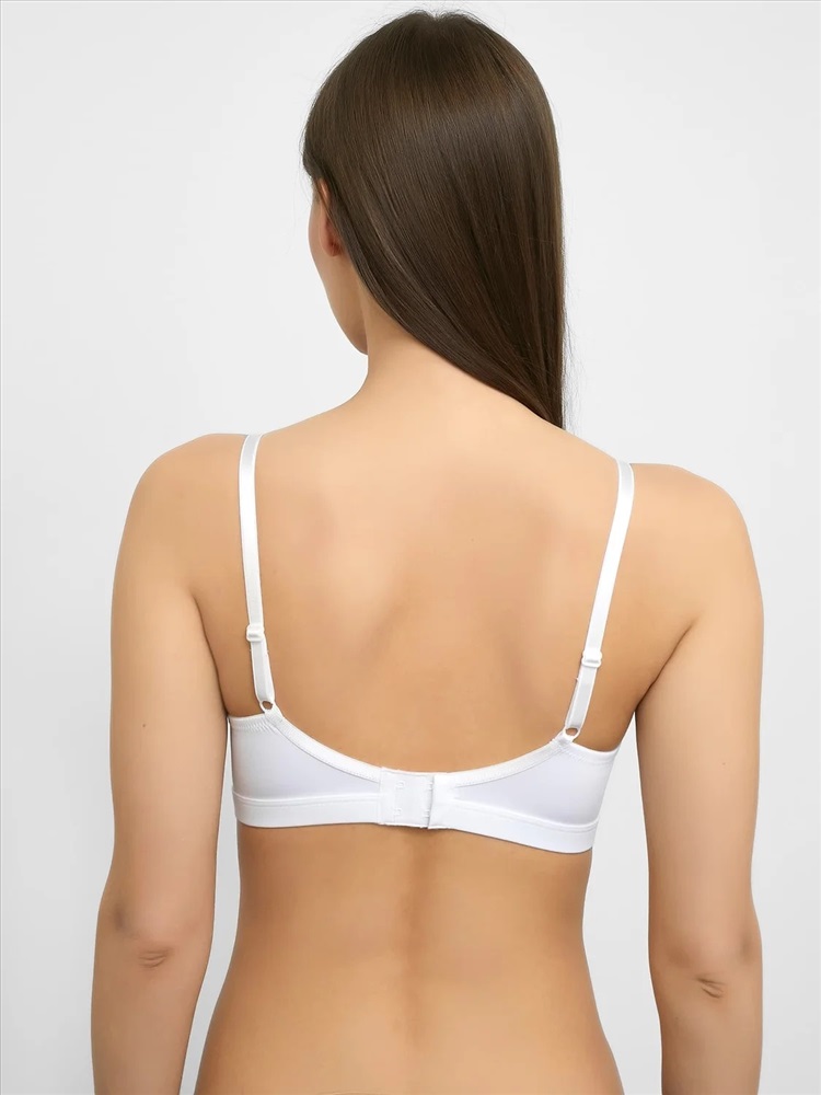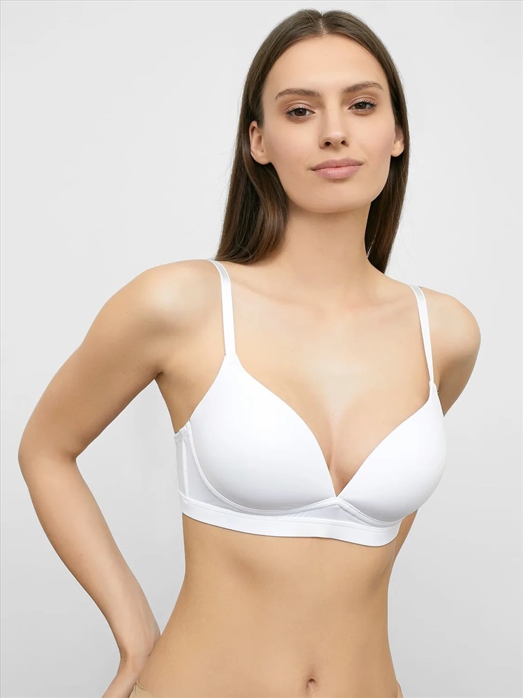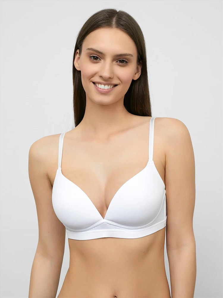 Бюстгальтер с мягкой подформовкой на жестких формованных чашках, без каркаса. Ластовица цельная с деталью стана на подкладке из микрофибры. Пластины в бок. деталях стана. Верхний срез стана обработан тесьмой. Нижний срез стана обработан окантовкой с внутренней тесьмой. Бретели. Кольца и регуляторы. Застежка двойная