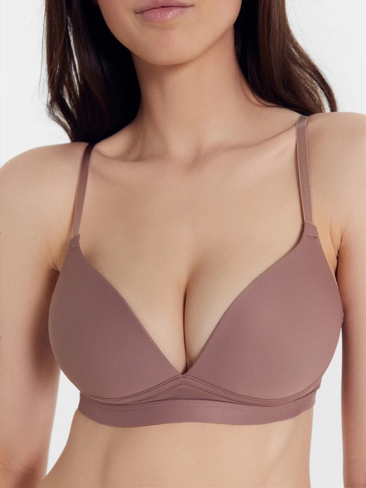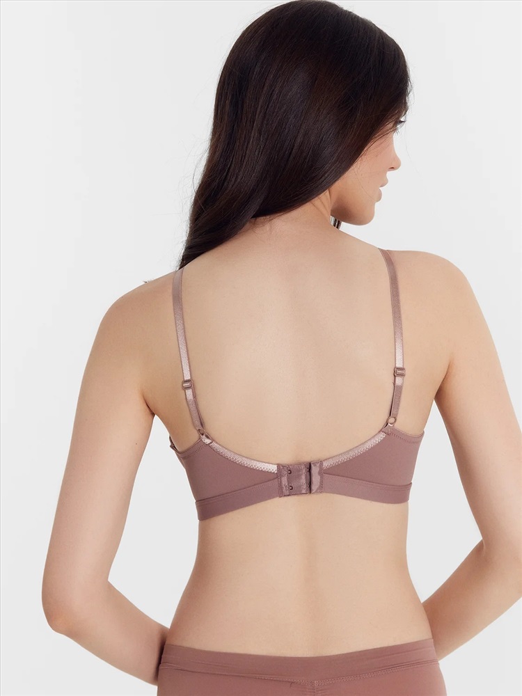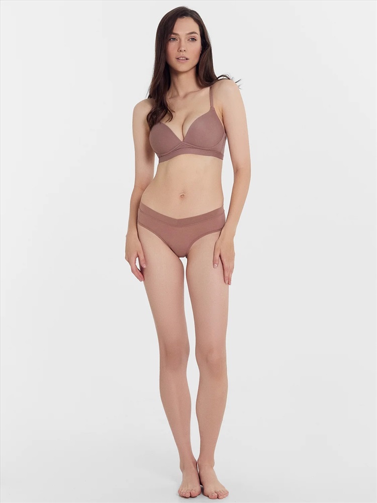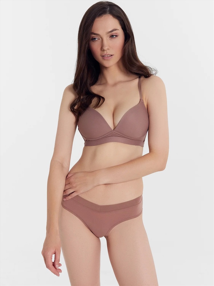 Бюстгальтер с мягкой подформовкой на жестких формованных чашках, без каркаса. Ластовица цельная с деталью стана на подкладке из микрофибры. Пластины в бок. деталях стана. Верхний срез стана обработан тесьмой. Нижний срез стана обработан окантовкой с внутренней тесьмой. Бретели. Кольца и регуляторы. Застежка двойная